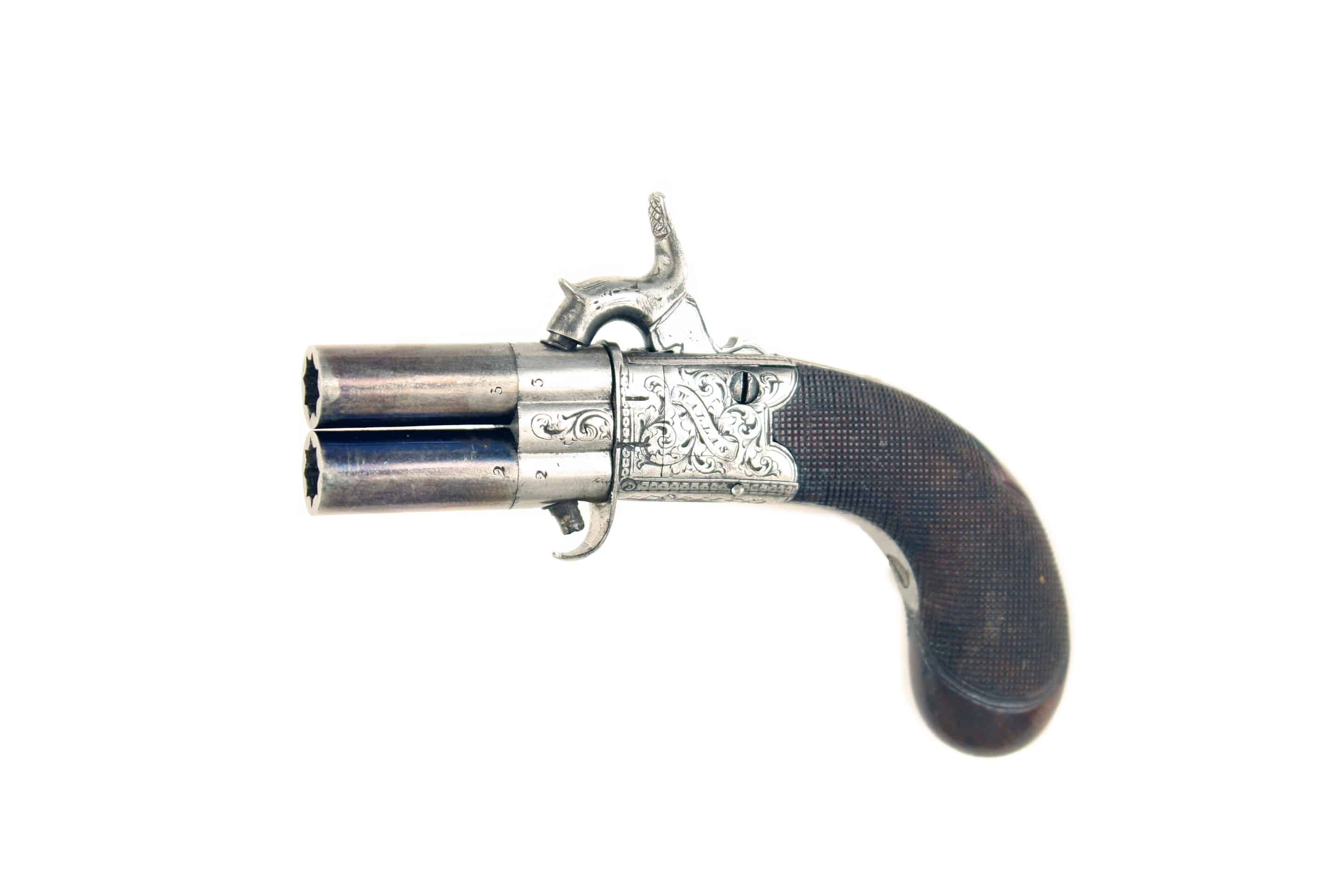 A Tiny Percussion Turn-Over Pistol. With blued turn off barrels, struck with Birmingham proofs, foliate engraved breech decorated with scrolling foliage and stamped with Birmingham proofs and numbered ‘2’ and ‘3’ foliate engraved box-lock action signed ‘WALLAS’ on a scroll to the left and ‘HEXHAM’ on a scroll to the right, fitted with a flip down trigger, chequered walnut butt with engraved oval escutcheon.