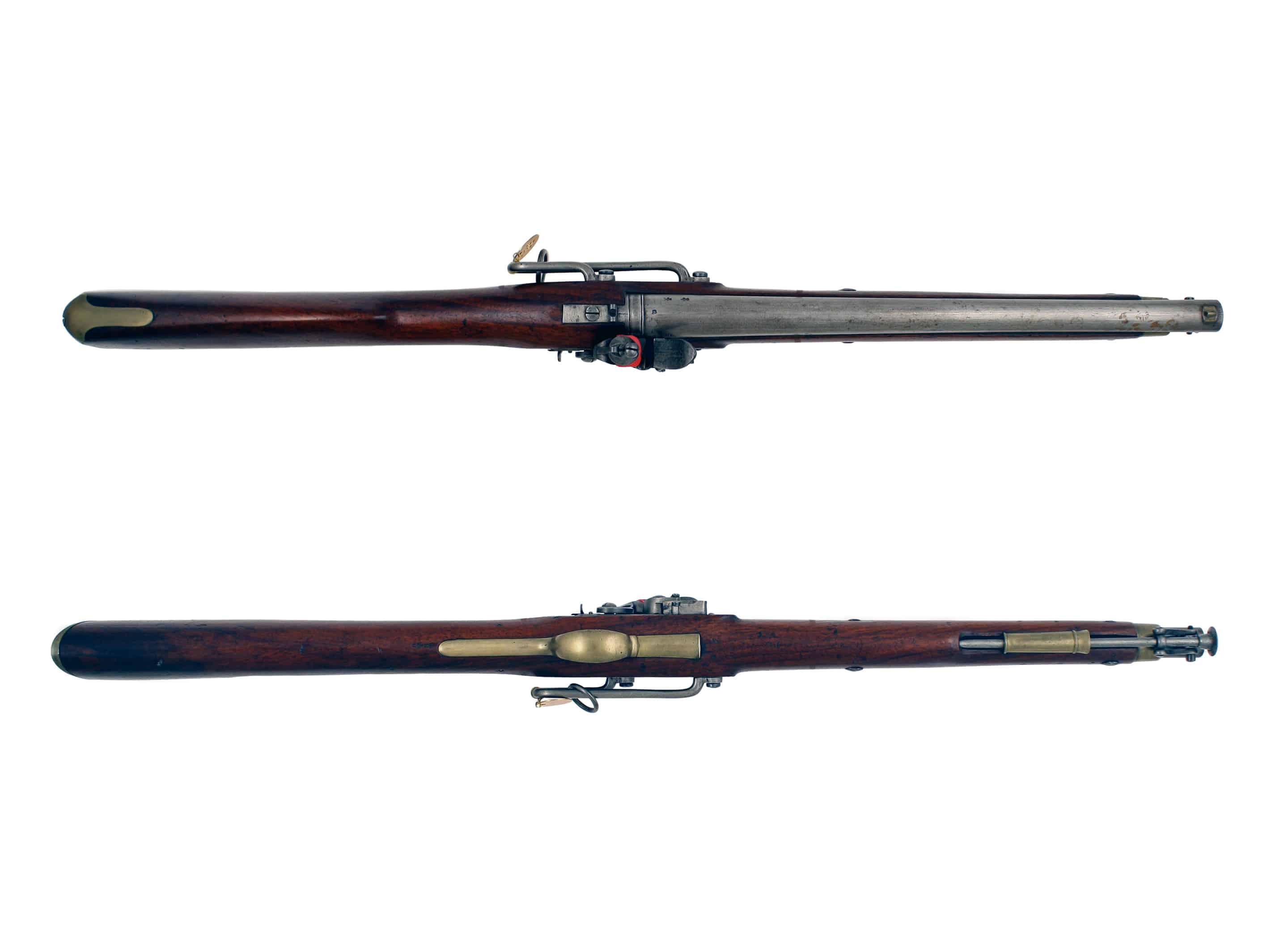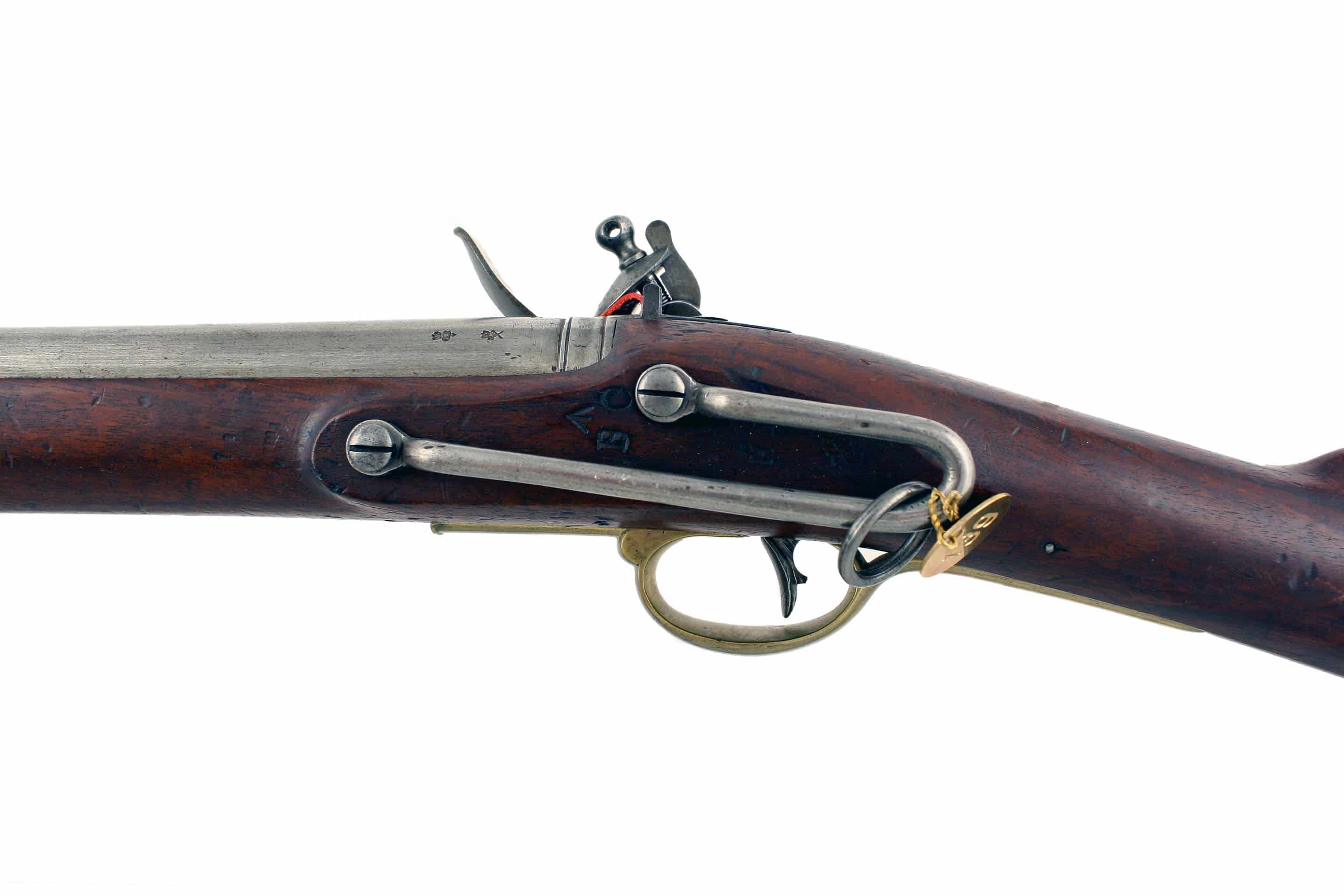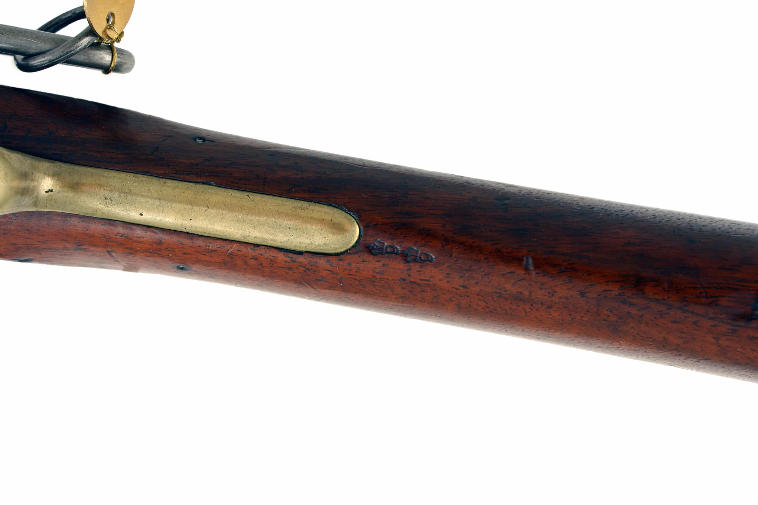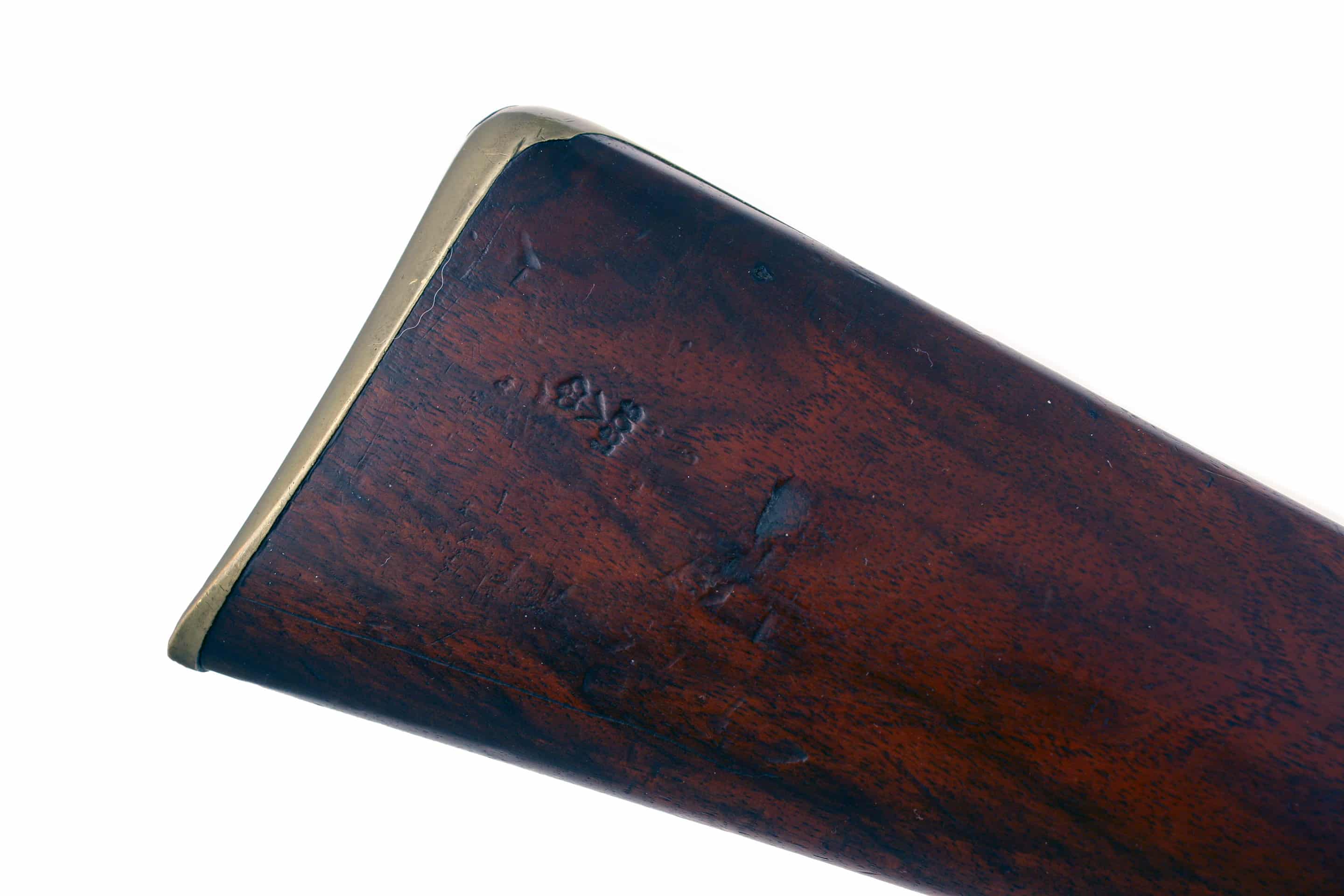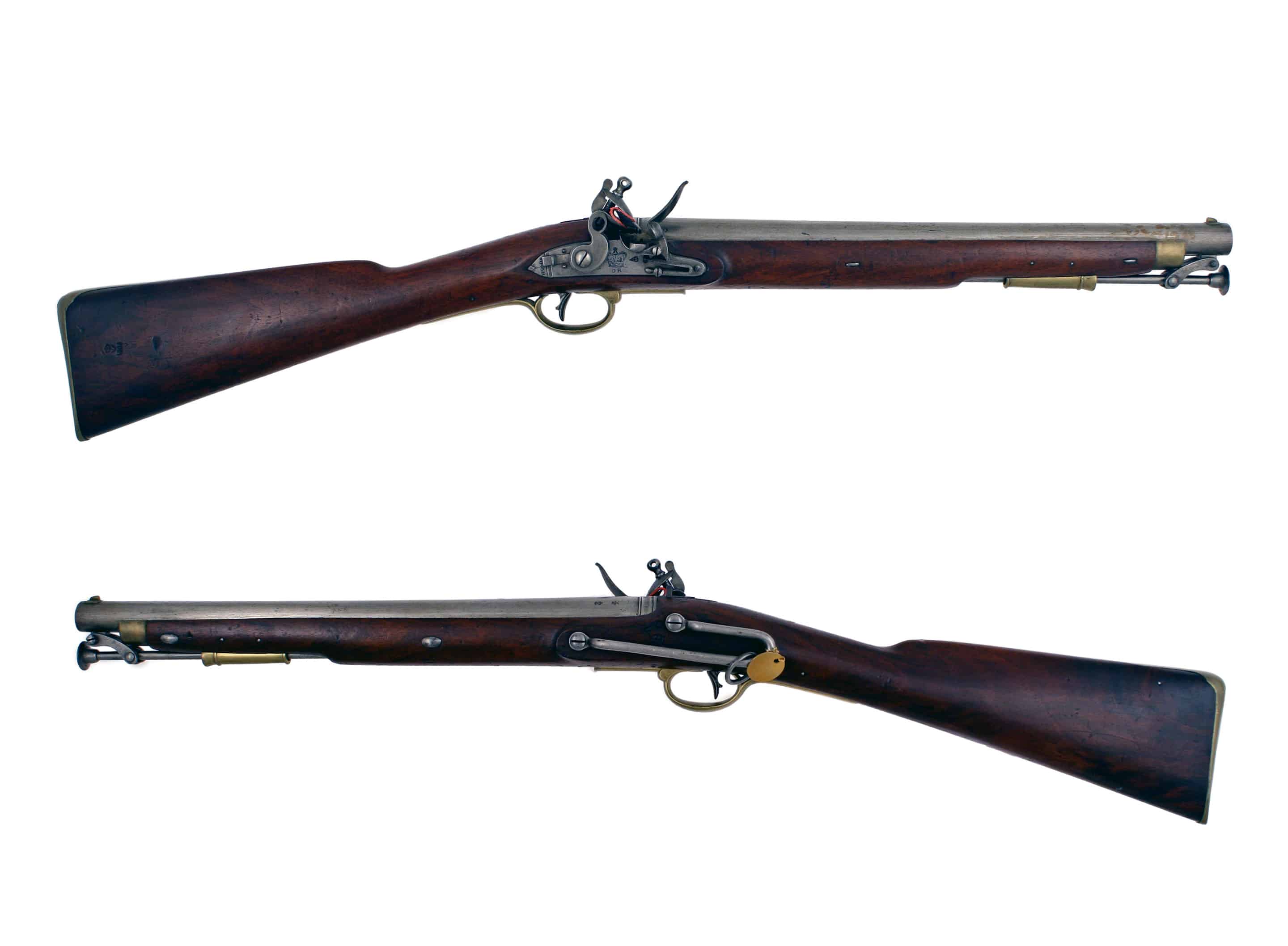 A Very Fine Flintlock Paget Cavalry Carbine. With round sighted barrel, baluster-moulded at the breech, with Tower military view and proof marks and stamped with a crown at the breech and with an “11” crowned above the touch hole, and with a fixed block “V” rear-sight on the tang, and a long, sloping, brass foresight. Plain, flat, bevelled, ring neck cock, plain, flat, bevelled, stepped, bolted 4½” lock with semi-waterproof pan, marked “GR” crowned, “Tower” on the tail, and with crowned broad arrow stamped horizontally below the pan, minor engraving on the pan bridle and on the tail of the lock, oval finial to the feather spring, and rounded toe to the frizzen. Figured walnut full stock, stamped with crowned broad arrow above “1805” on the right side of the butt, with the “BO” and broad arrow mark, “TH” and crowned “G” on the side-plate, and with crowned “9” twice behind the trigger guard tang. Regulation brass mounts comprising forend cap, butt plate, trigger guard with Baker style squared off front finial, the inside stamped with a crown, single, trumpet, ramrod pipe, original sling bar and ring, and original iron swivel ramrod stamped with a crowned “9” near the tip, crowned “13”, crowned “2”, and another stock-maker’s mark stamped in the ramrod channel, and the centre of the point of the rod drilled and tapped to receive attachments. Excellent working order and very fine, unissued, condition. Circa 1805.
