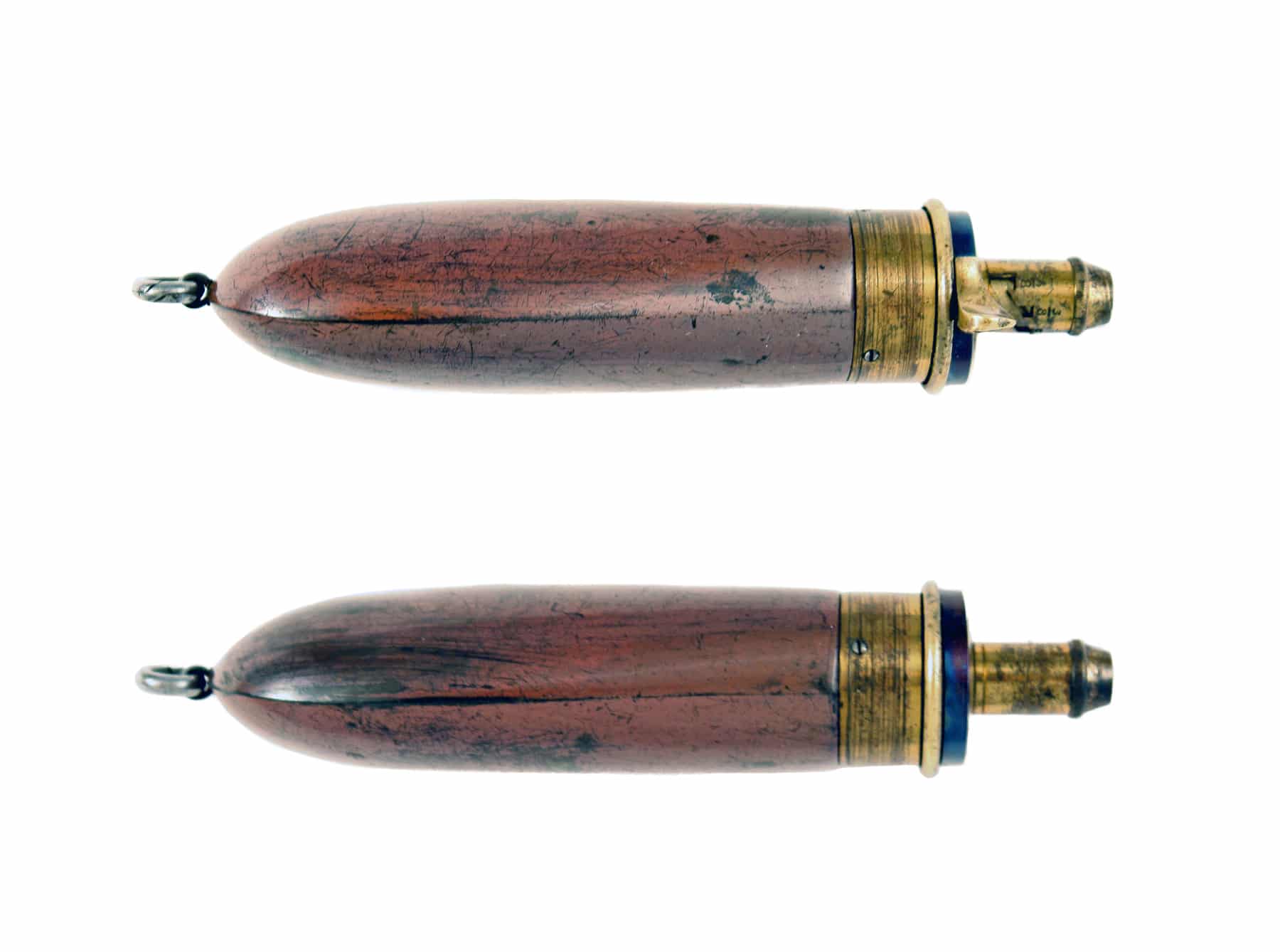 A Very Good Revolver Flask. With tear drop body, suspension ring at the base, brass top with graduated nozzle and blued spring.