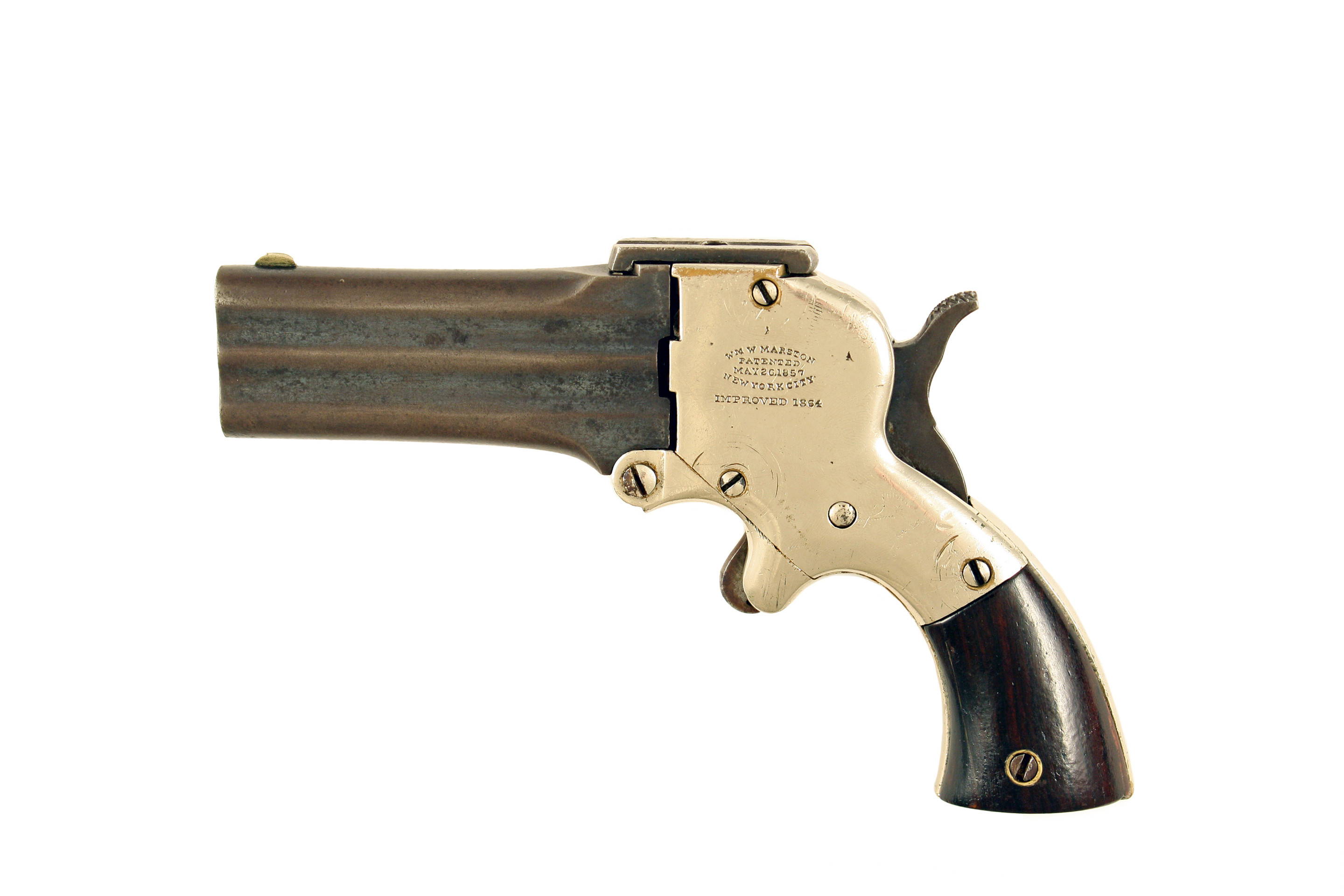 A William W. Marston Three-Barrel Derringer. With sighted three-shot barrel block retaining some original finish that has mellowed, silvered frame (retaining a large amount of original silvering) stamped, ‘WM. W. MARSTON / PATENTED / MAY 26. 1857 / NEW YORK CITY’ and with ‘IMPROVED 1864’ beneath, spur trigger and slab rosewood grips.