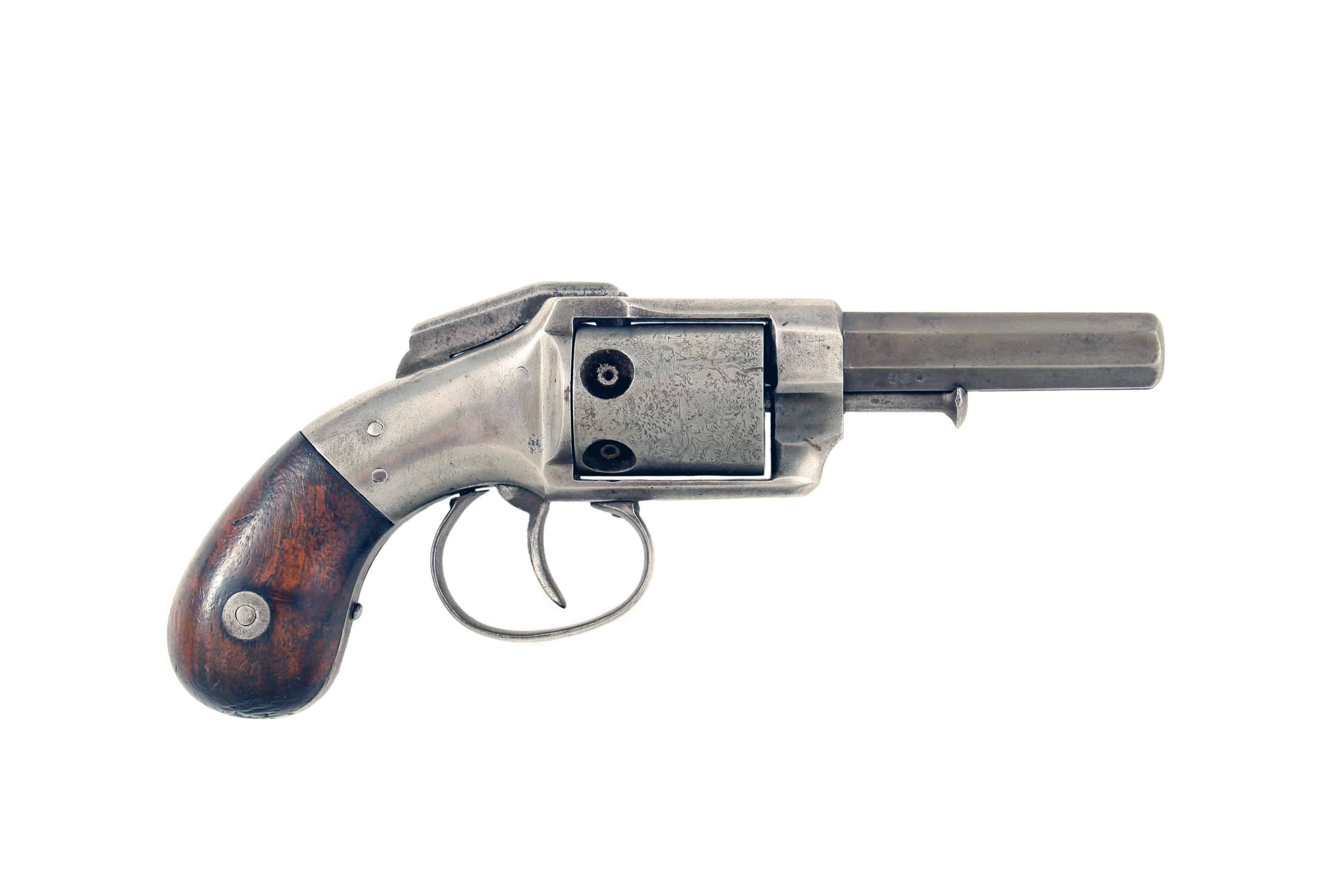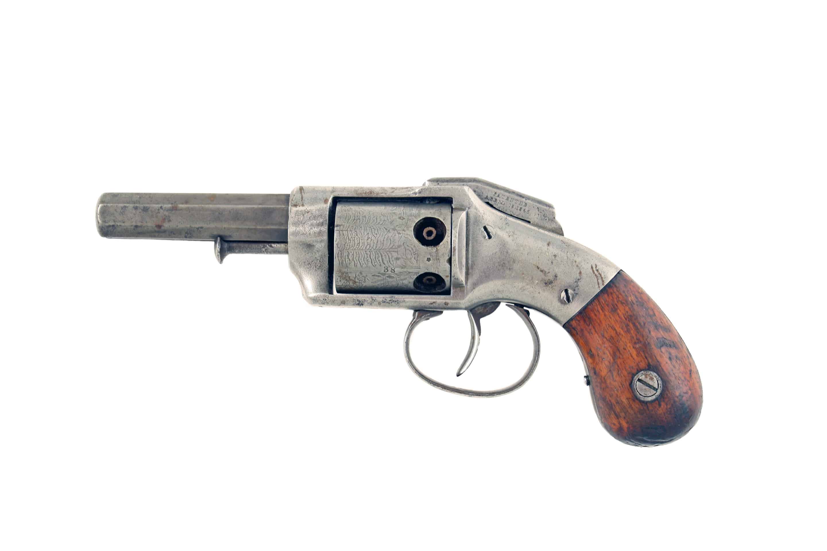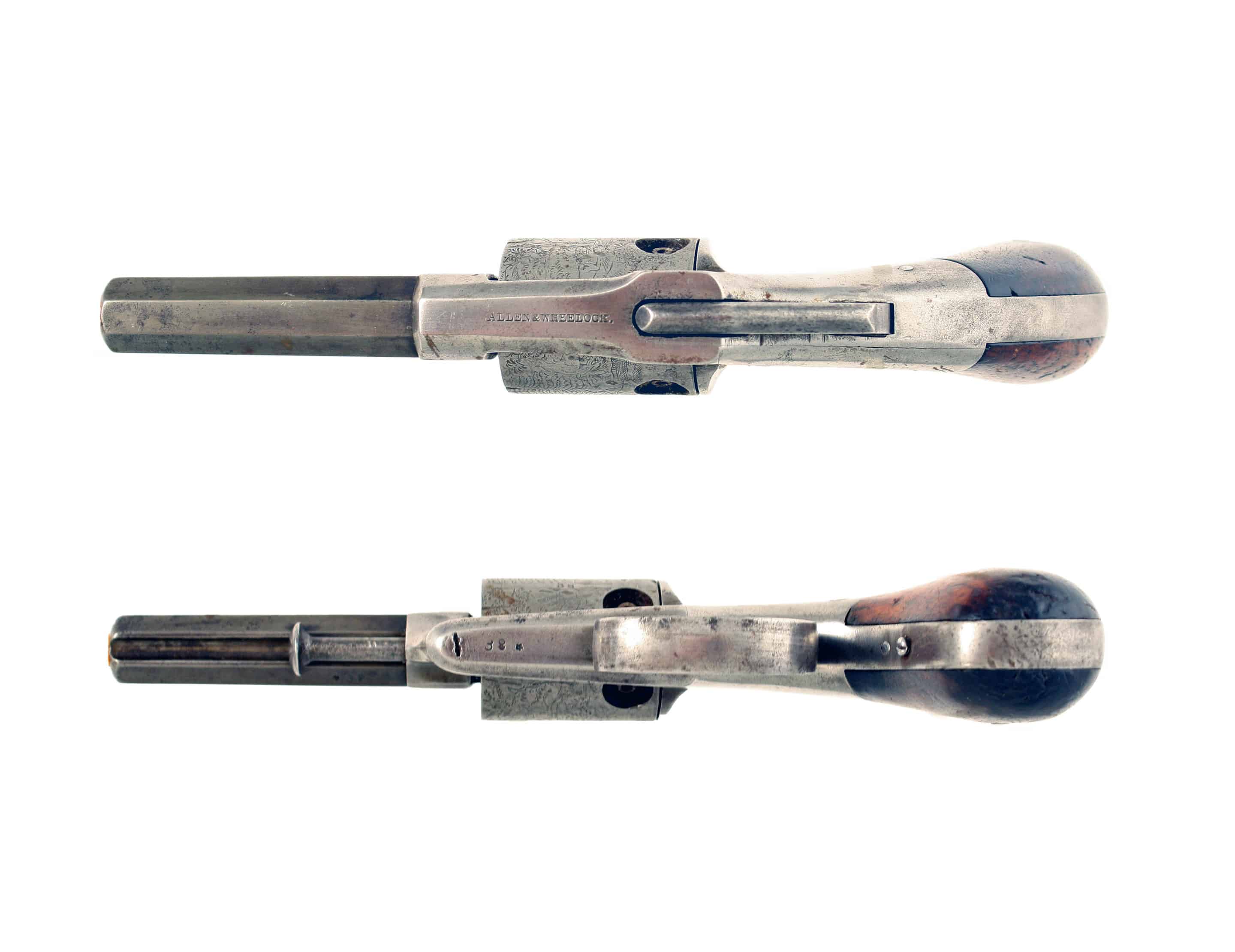 Allen & Wheelock Large Frame Pocket Revolver. With rifled octagonal barrel, stamped, ‘ALLEN & WHEELOCK.’ Along the top-strap, numbered cylinder with forest scene, trigger guard and rounded wooden grips. The pistol numbered ’38’ throughout.