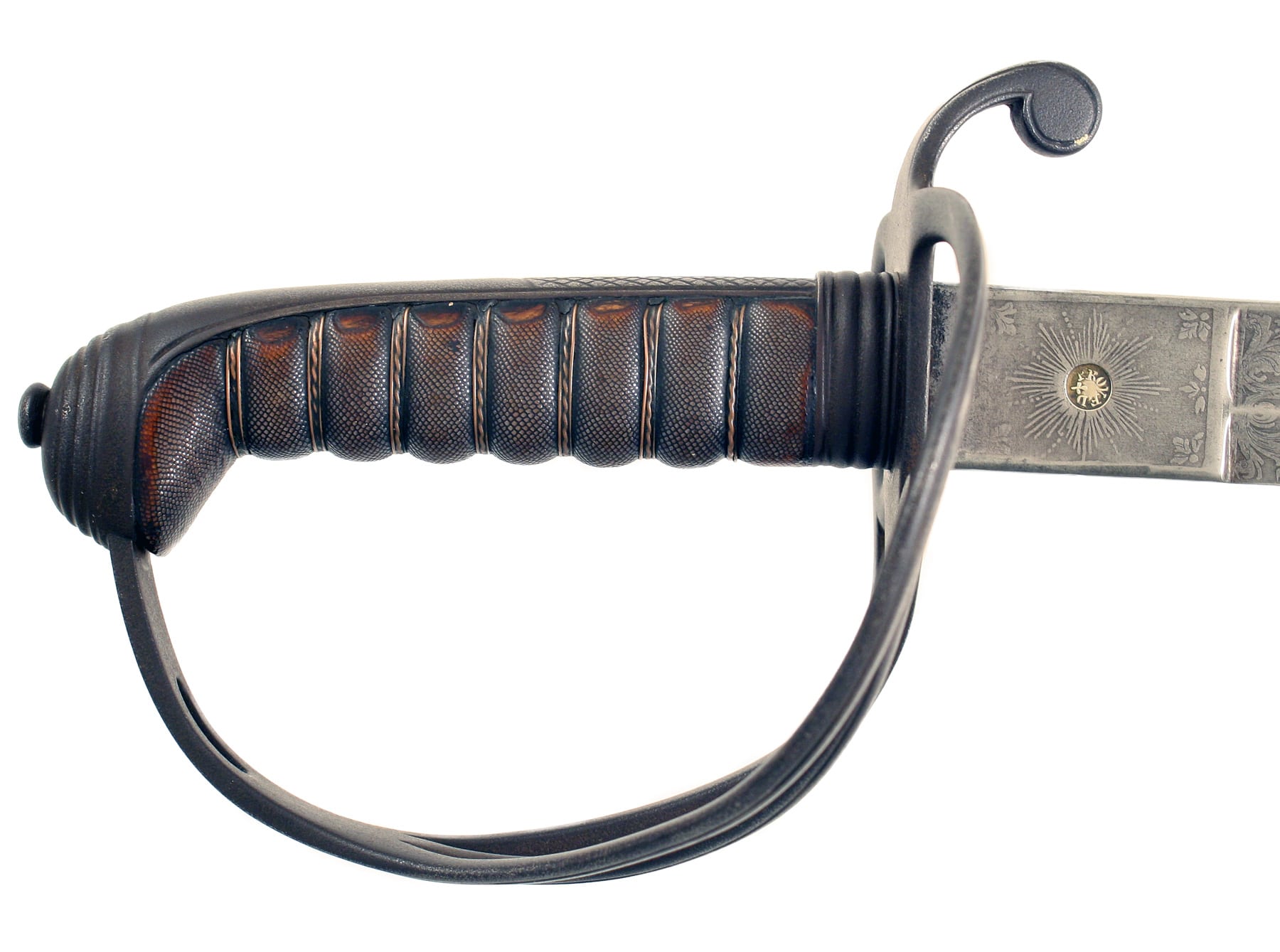 An Artillery Officers Sword by J. Lyons of Woolwich. With slightly curved singled edged blade cut with a long, deep fuller running along the back edge of the blade, double edged at the point, etched with scrolling foliage, regulation steel three bar hilt with wire bound fish skin grip (some losses to fish skin) in its steel scabbard with two suspension rings.