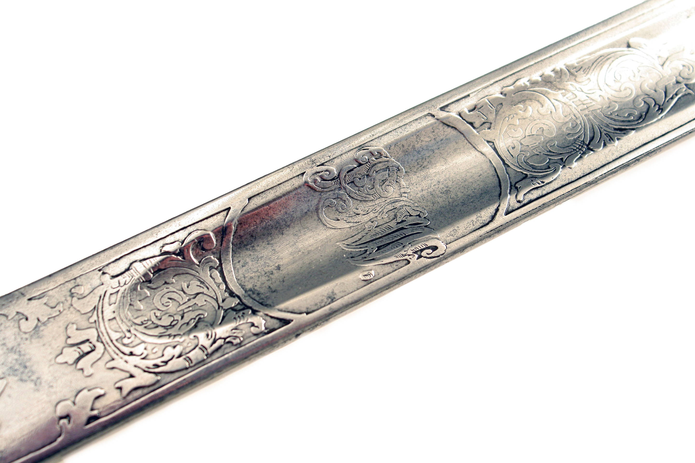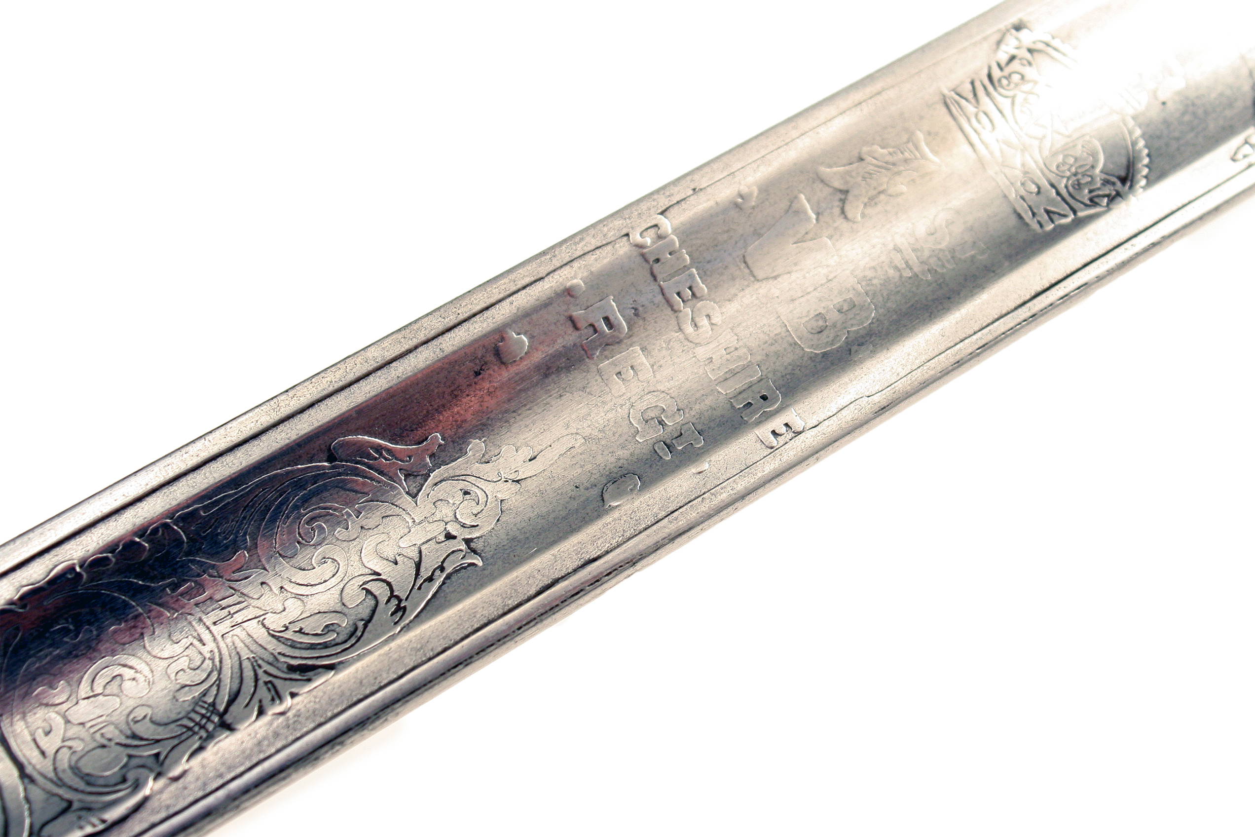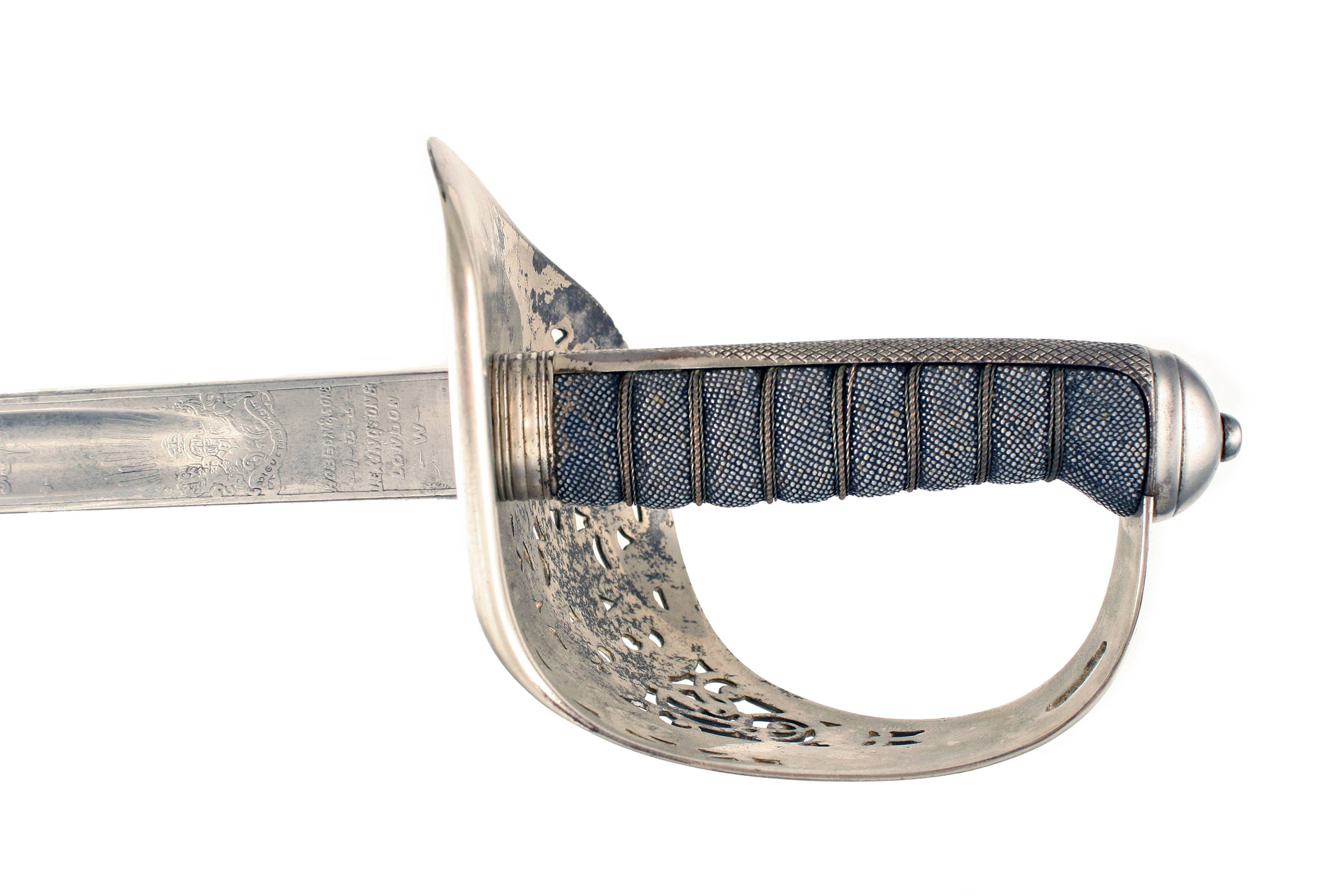 An attributed Edward VII 1897 Pattern Infantry Officers Sword to Major Pedro Telesforo Wessel of the Cheshire Regiment. The sword blade is etched to the 1st Volunteer Battalion Cheshire Regiment and with the owners initials PTW. The sword was retailed by Hobson & Sons of 1-3-5 Lexington St., London, the proof mark on the blade suggests it might have been made by the well known quality sword manufacturer Pillin, who is known to have supplied Hobson & Sons.