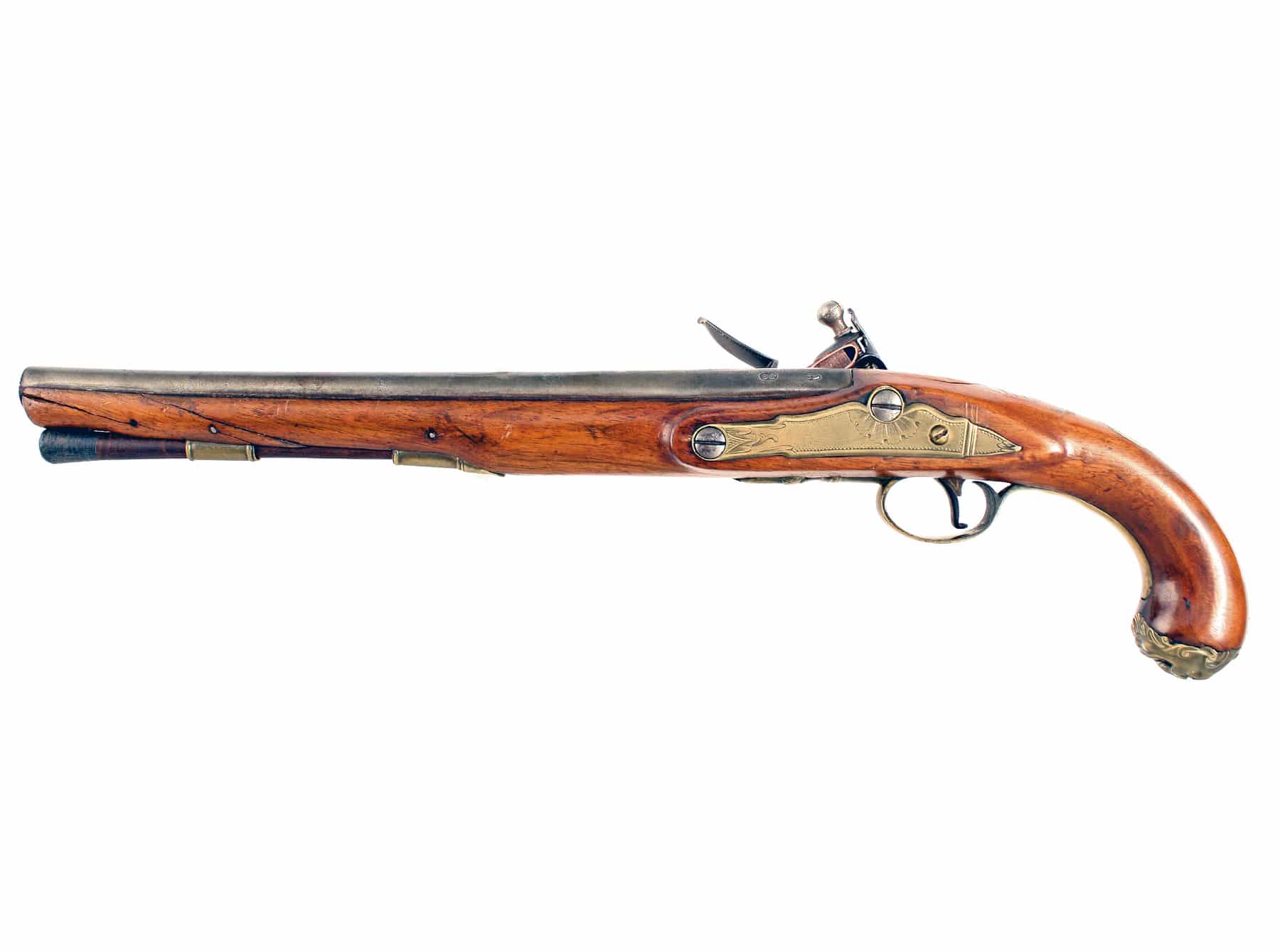 An Early Flintlock Holster Pistol by Harvey. With long tapering barrel engraved ‘LONDON’ along the top-flat and stamped with London proofs, foliate engraved tang, signed border engraved lock, cock decorated en suite, full-stocked in walnut (some cracks to fore-end: see photographs) with raised moulding around the tang, completed with brass furniture comprising engraved side-plate, brass grotesque butt mask, trigger guard decorated with a flower on the bow and acorn finial and turned ramrod pipes with horn tipped ramrod.