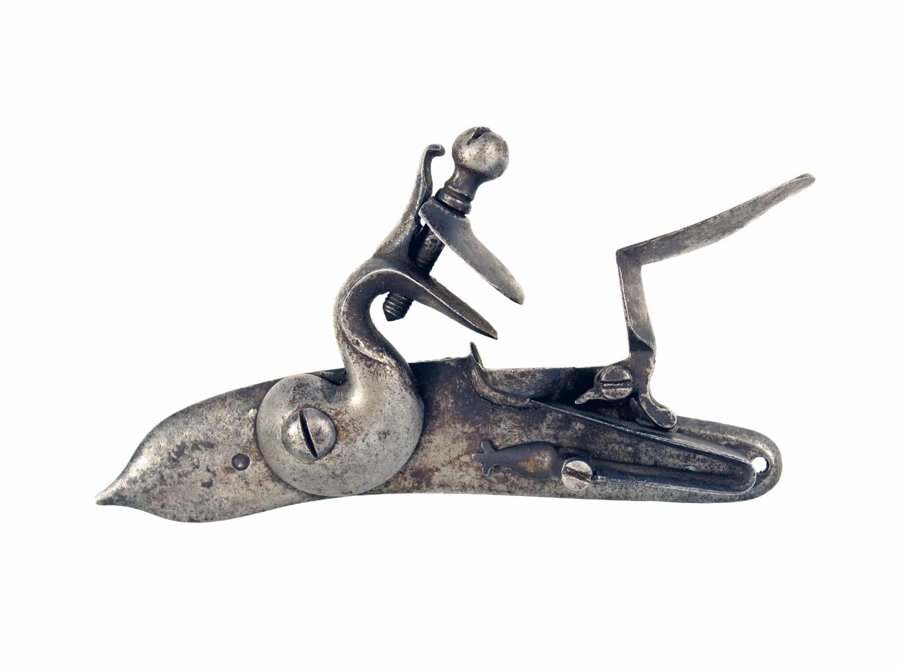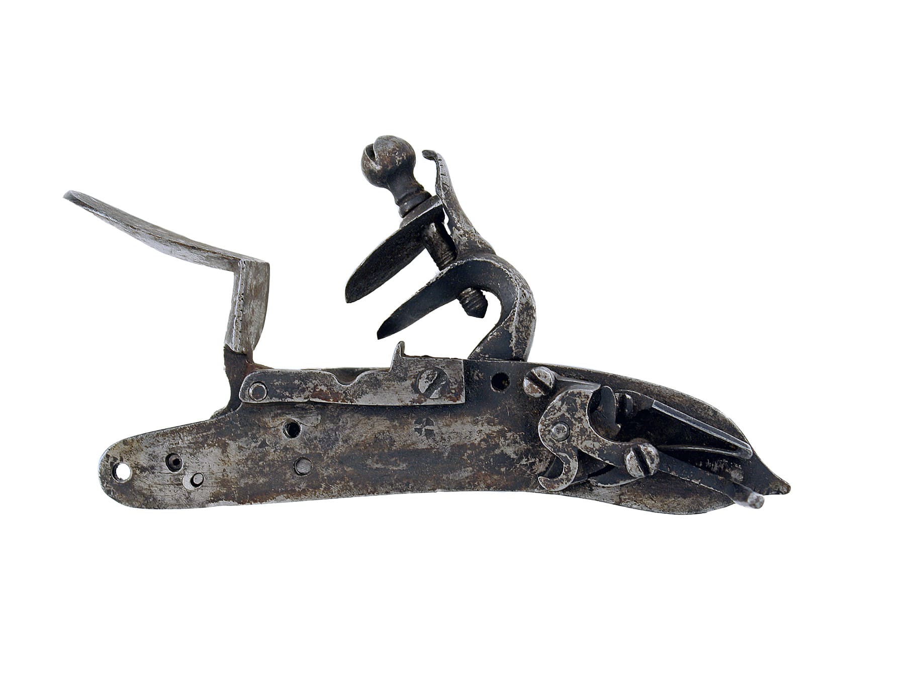 An Early Flintlock Mechanism. Of rounded ‘banana’ shape, simple construction, stamped internally with what appears to be the Cross of St George mark.