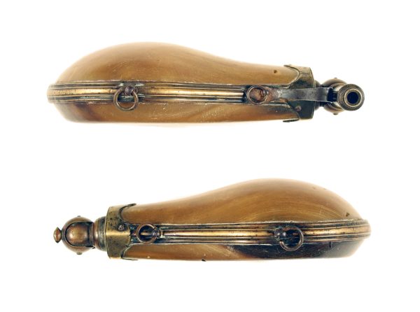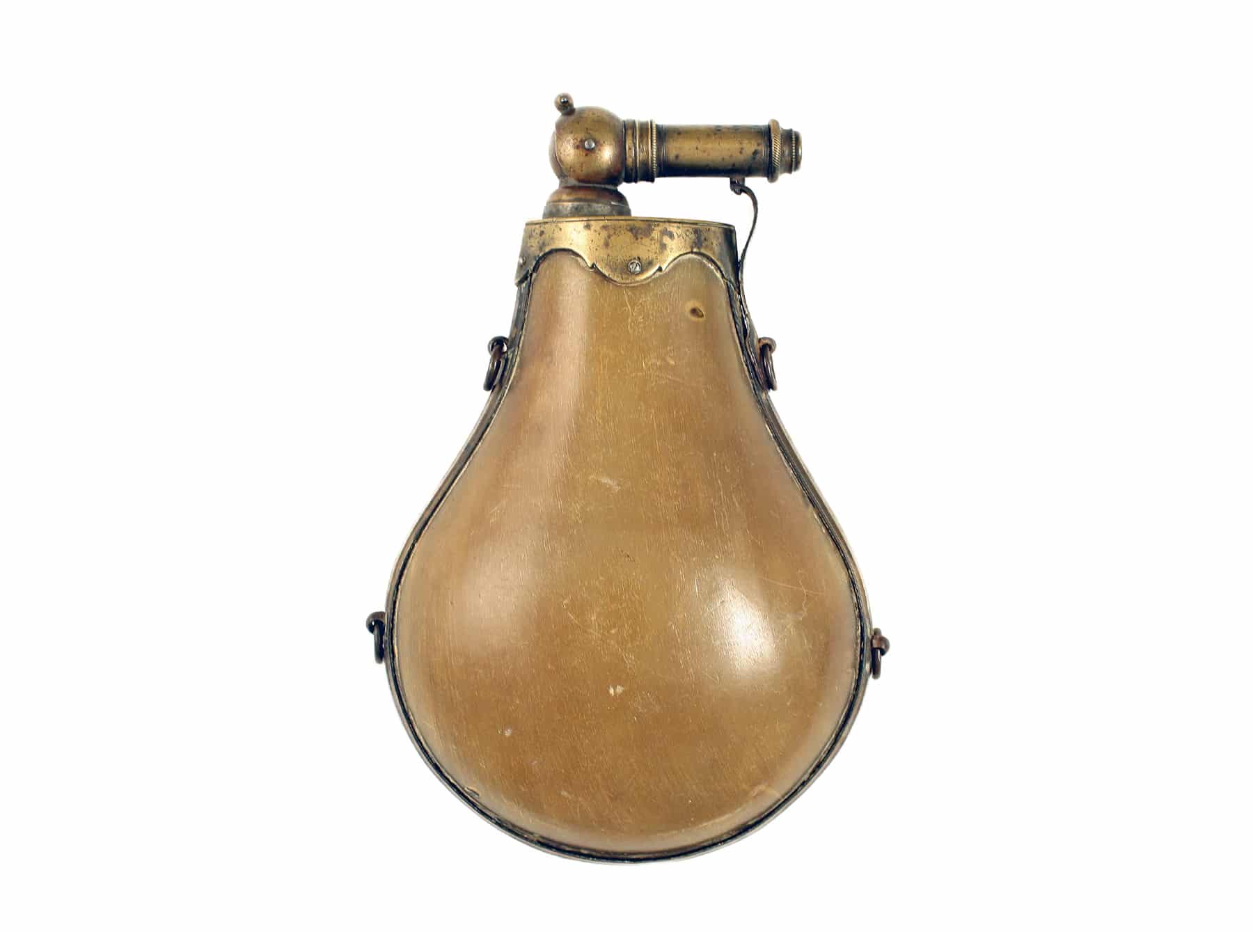 A Large Horn Flask with Flip Charger. With one side of flattened horn and the other convex, metal seems with four suspension rings, sprung charger. A nice big flask.