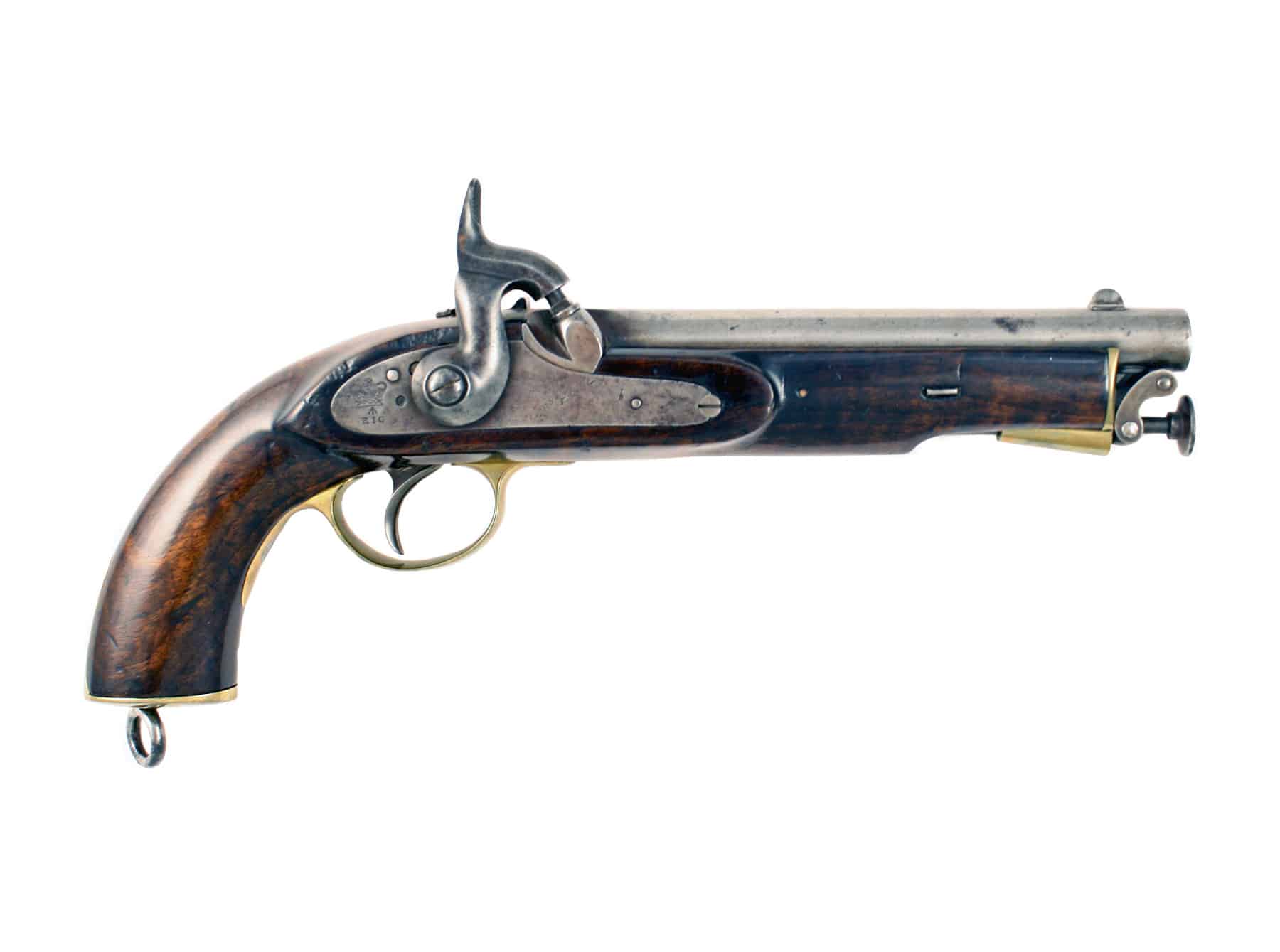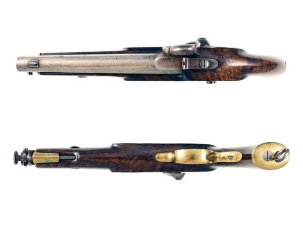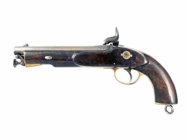 A 16 bore percussion holster pistol built for the East India Government in 1871. The barrel is struck with Birmingham inspectors marks and Tower of London military proof marks, The walnut full-stock is struck with the Birmingham inspectors mark, and the stock-makers marks and the Birmingham E.I.G. storekeepers stamp. The lock is stamped Birmingham 1871 and with a crowned broad arrow above E.I.G. together with a Birmingham inspectors stamp. The pistol is fitted with regulation brass mounts, a swivel ramrod and lanyard ring.