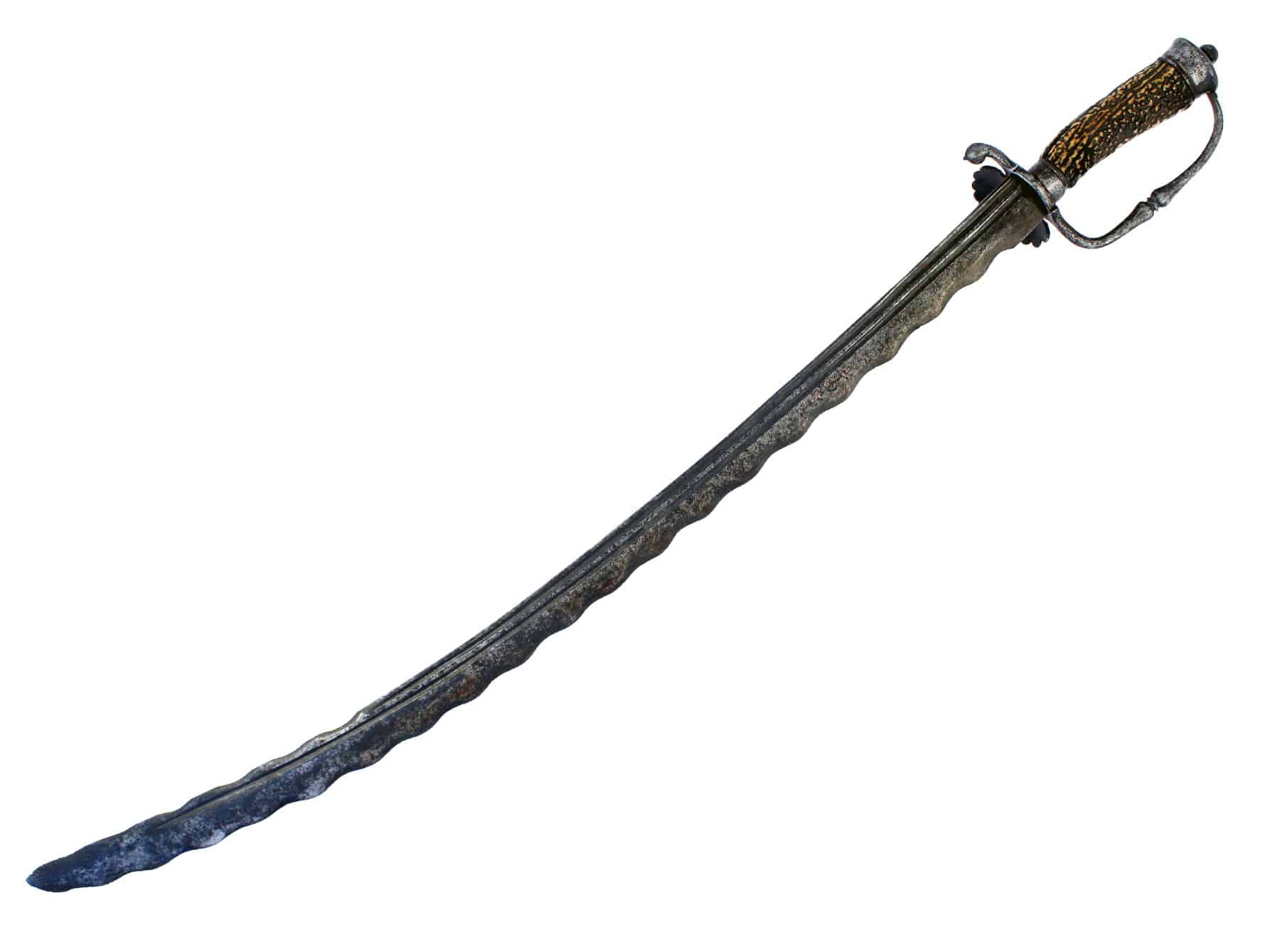 A 17th Century English Hanger, with slightly curved single serrated edged blade, double edged towards the point, cut with two fullers running along the back edge, and inset with brass makers mark, iron hilt with down-turned shell-guard, knuckle guard and flat pommel, antler grip.