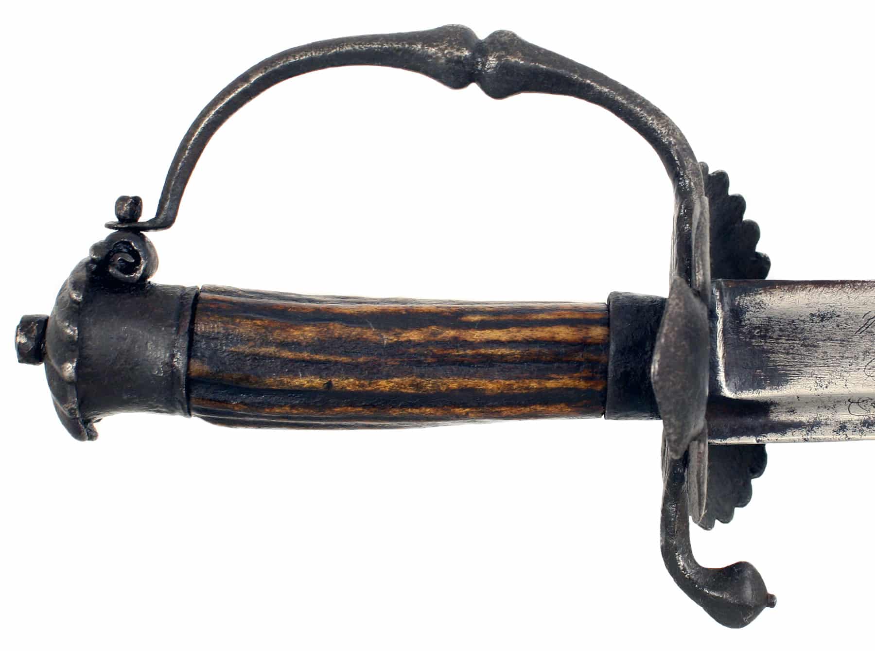 A 17th Century English Hanger, With slightly curved double-fullered blade retaining traces of original engraving, animals and hunting scenes, iron hilt with downturned shell guard, D-shaped knuckle guard with mushroom pommel, antler grip.