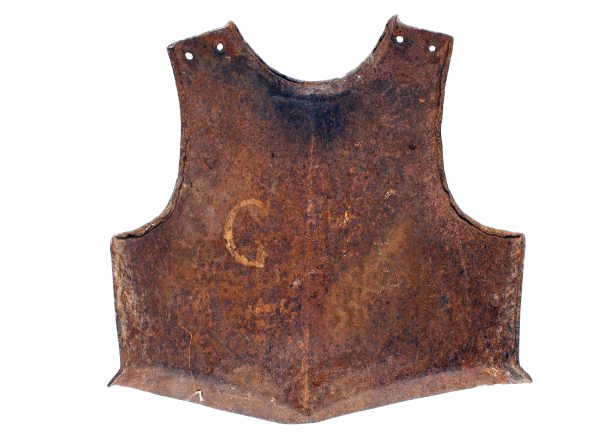 An English Harquebusiers Breastplate, With raised neck and medial ridge terminating in a point at the waist, which dips down to the centre and has a narrow flange. The neck and arms edges have plain inward turns. At either side of the chestier mushroom headed studs for fastening the shoulder straps. A nice untouched example. Russet iron.