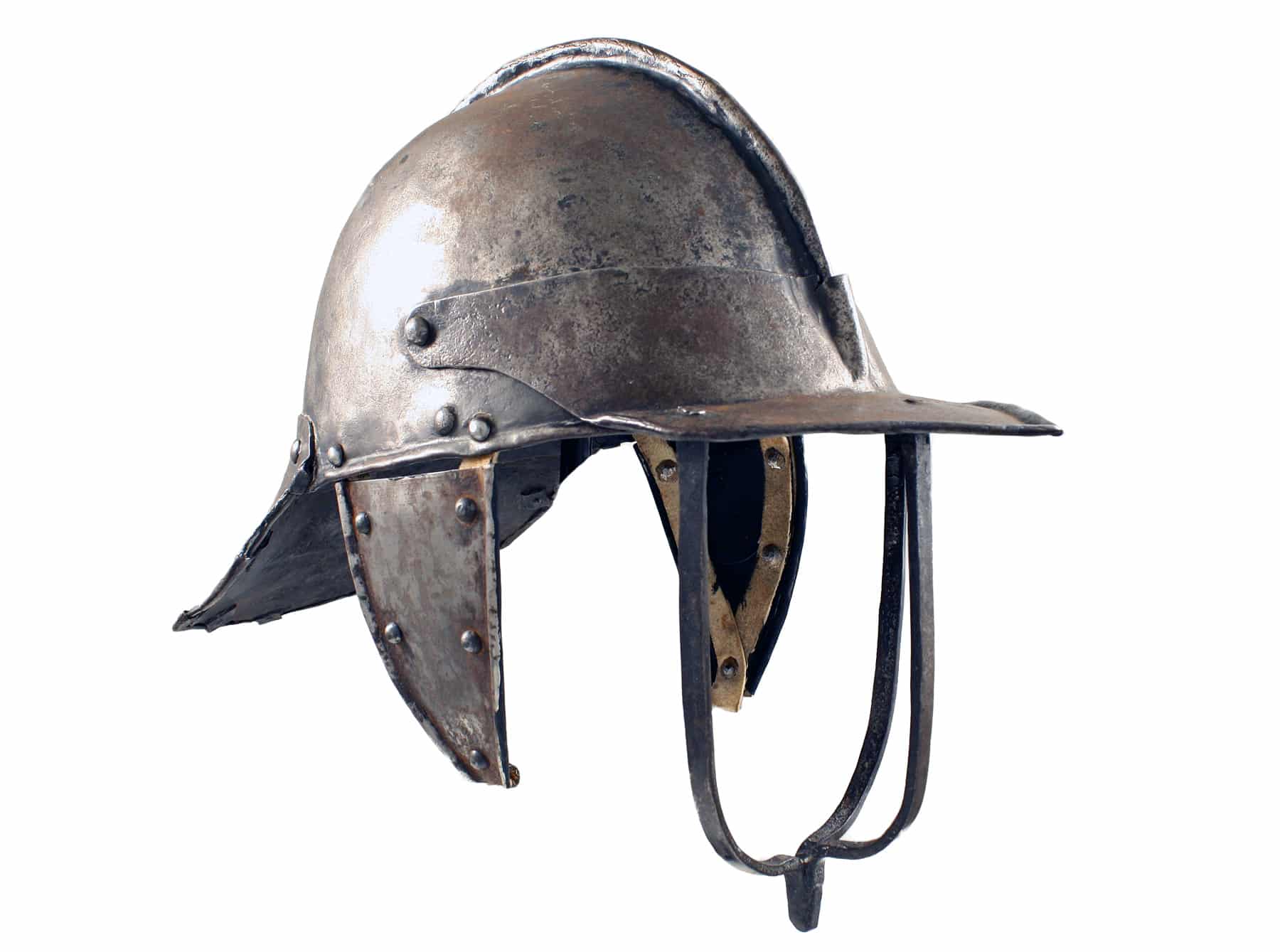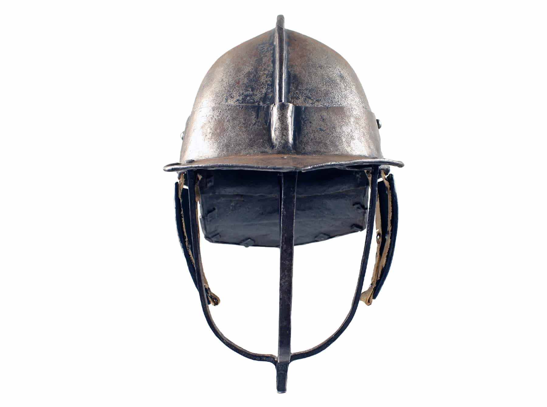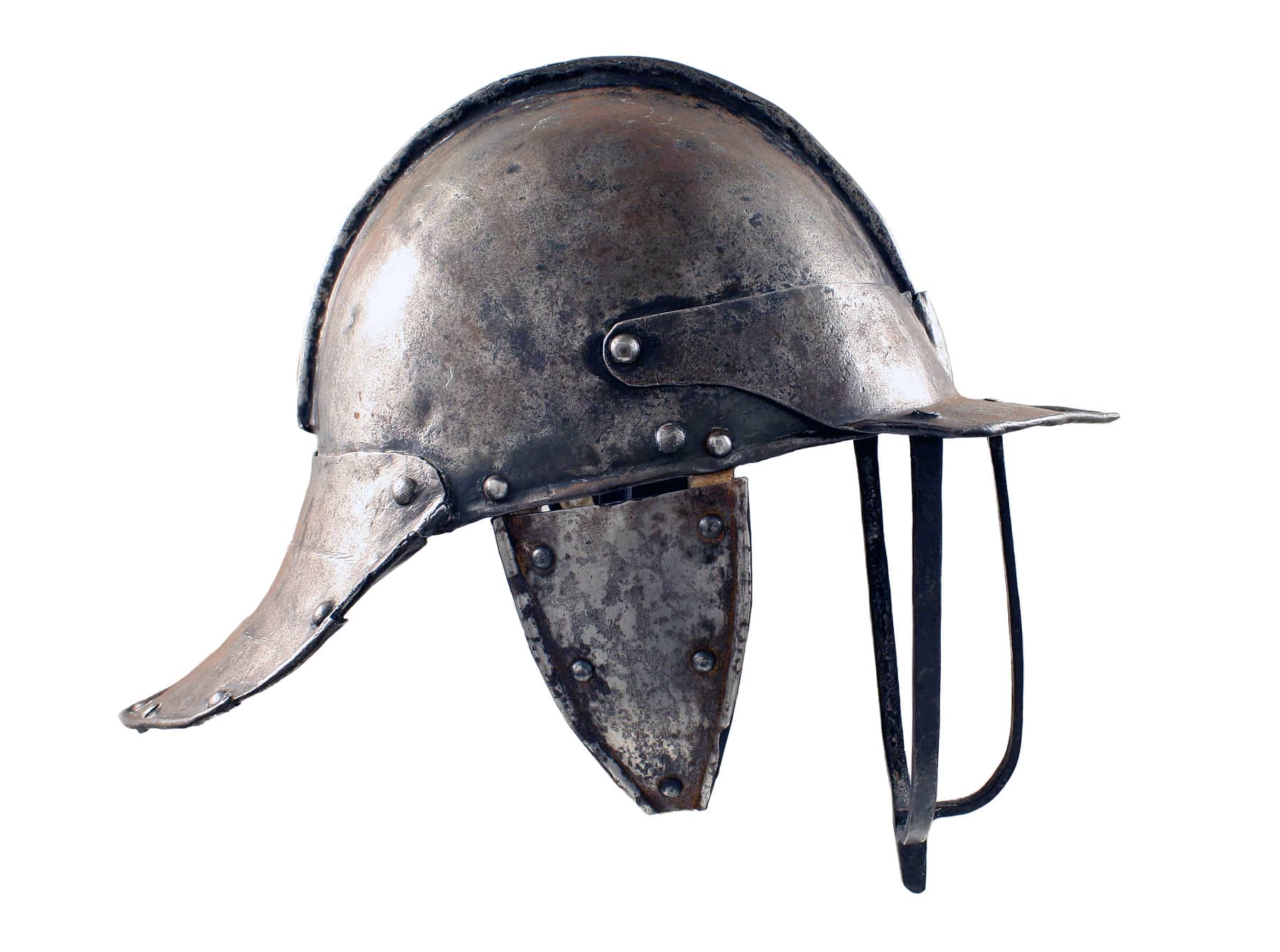 An English Harquebusiers Pott. comprising pot with hemispherical skull formed in two pieces joined medially along a low comb, fitted at the brow with a slightly down-turned pivoted peak struck at its left side with the maker’s mark ID and supporting on its underside a triple-barred face-guard, at the nape with a one-piece neck-guard embossed to simulate three lames, and its sides with pendent cheek-pieces (replacements).