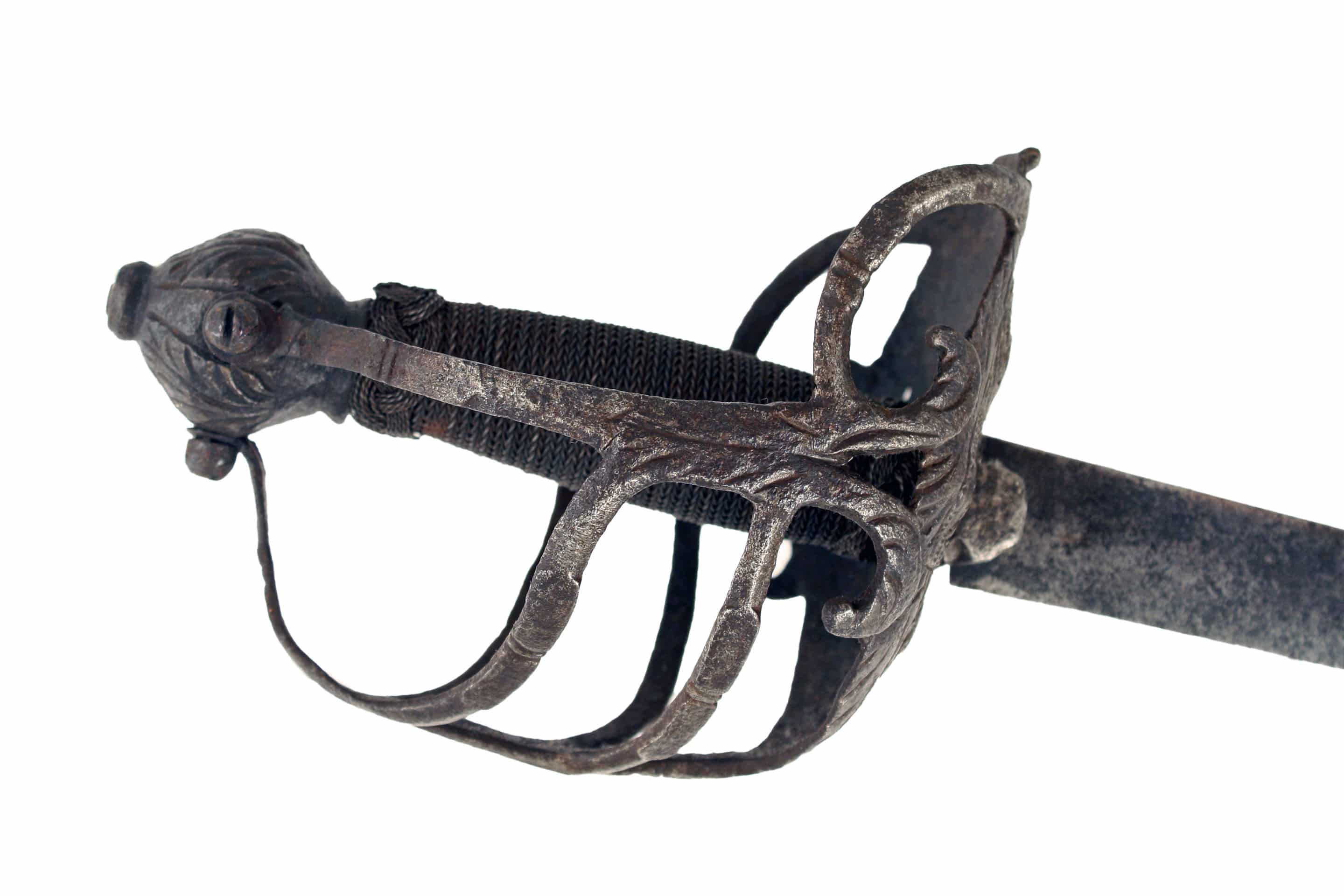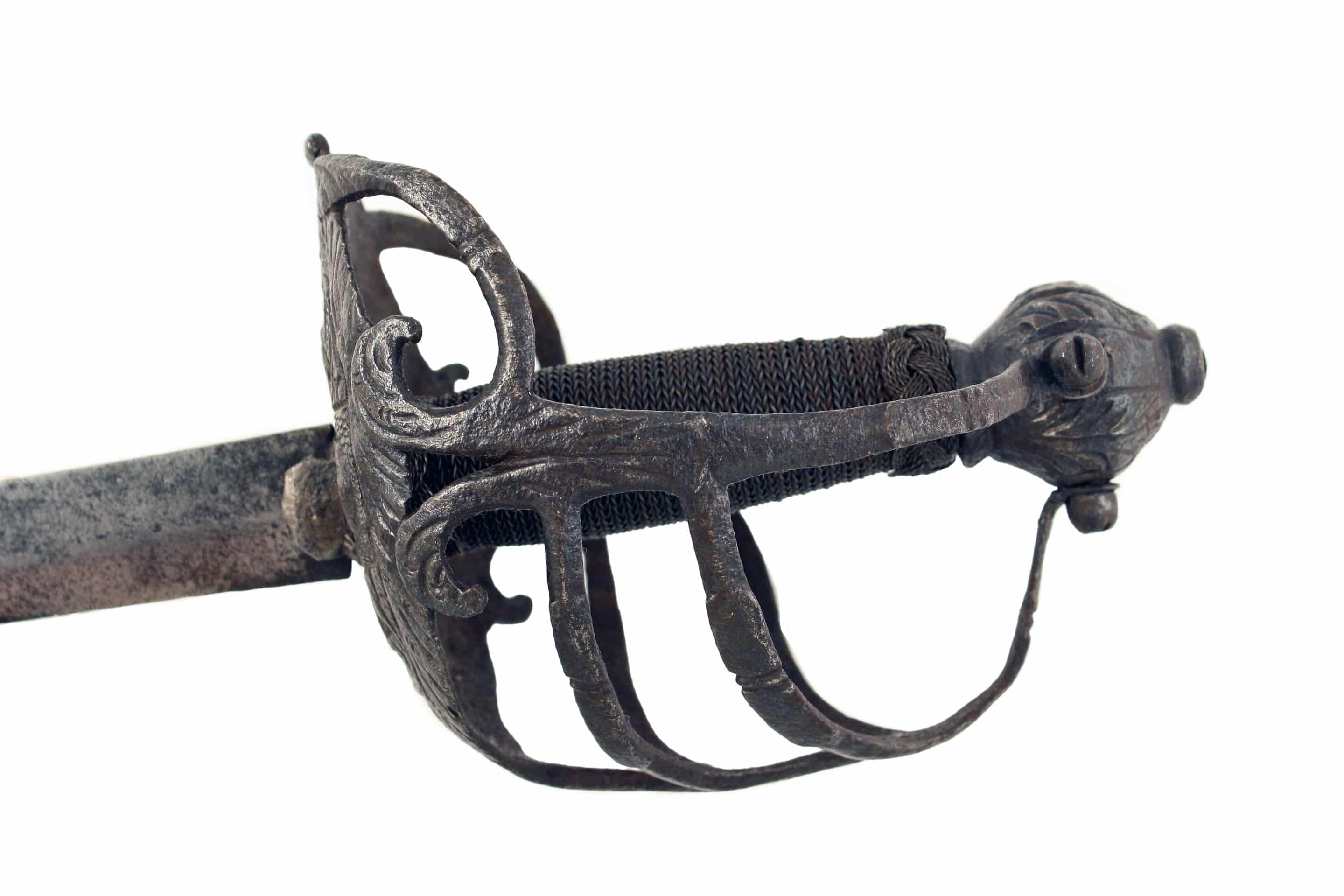 An English ‘Mortuary’ Hilted Backsword. With narrow single edged blade, double-edged at the point, some nicks along the cutting edge from use, iron hilt comprising solid guard chiselled masks on each side amid symmetrical scrolling foliage, all against a chiselled ground, short scrolled wrist-guard, knuckle guard flanked by two diagonal bars linked to the bifurcated side-bars and chiselled with foliage, the top of the knuckle-guard and side-bars screwed to a globular pommel with button, wire bound grip with two Turks heads.