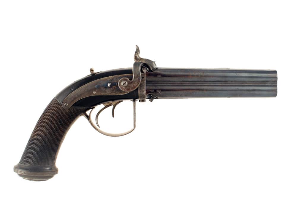 An Extremely Rare Cased 28-Bore Four-Barrelled Percussion Turn-Over Pistol by J. Purdey, No. 314½ Oxford Street, London, No. 2119 For 1832. With sighted blue black barrel-block of one piece with four integral sunken ribs, case-hardened breech and tang made in one piece, the former engraved with guilloche, the latter grooved for sighting, finely engraved with a martial trophy and foliage, and fitted with bright foliate engraved sliding thumb-catch securing the barrels, case-hardened serial numbered foliate scroll engraved rounded back-action locks each signed in full on the tail and fitted with blued safety-catch behind the dolphin hammer (hammer spurs expertly repaired), the hammers each engraved with a martial trophy, chequered ebonised rounded butt, large blued D-shaped trigger-guard engraved on the bow with a martial trophy within guilloche borders, border engraved case-hardened ovoidal pommel with hinged foliate engraved butt-trap cover, border engraved vacant silver escutcheon, chequered forward trigger, and nearly all its original finish: in original lined and fitted brass-mounted mahogany case (split at the lock) with accessories including lacquered brass powder-measure, nipple-key and flask (cut-off spring incomplete), the lid (trade label missing) with flush-fitting brass carrying handle centred on a vacant circular brass escutcheon.
