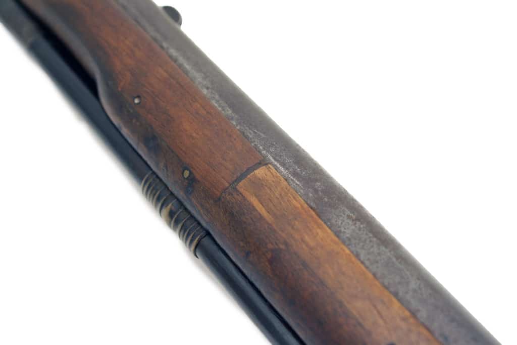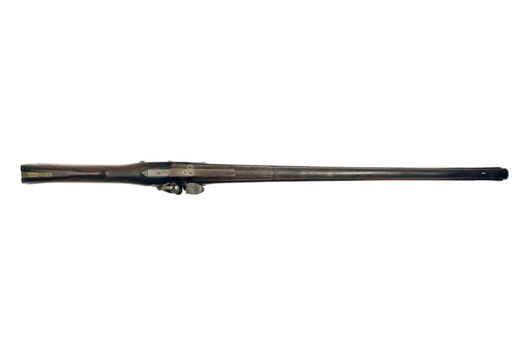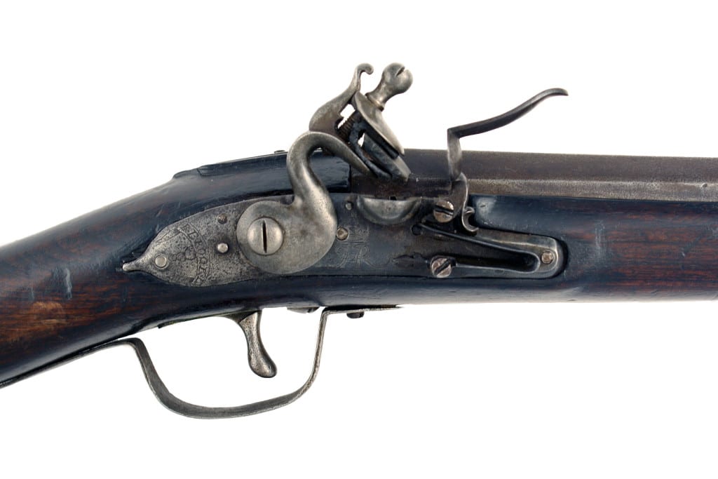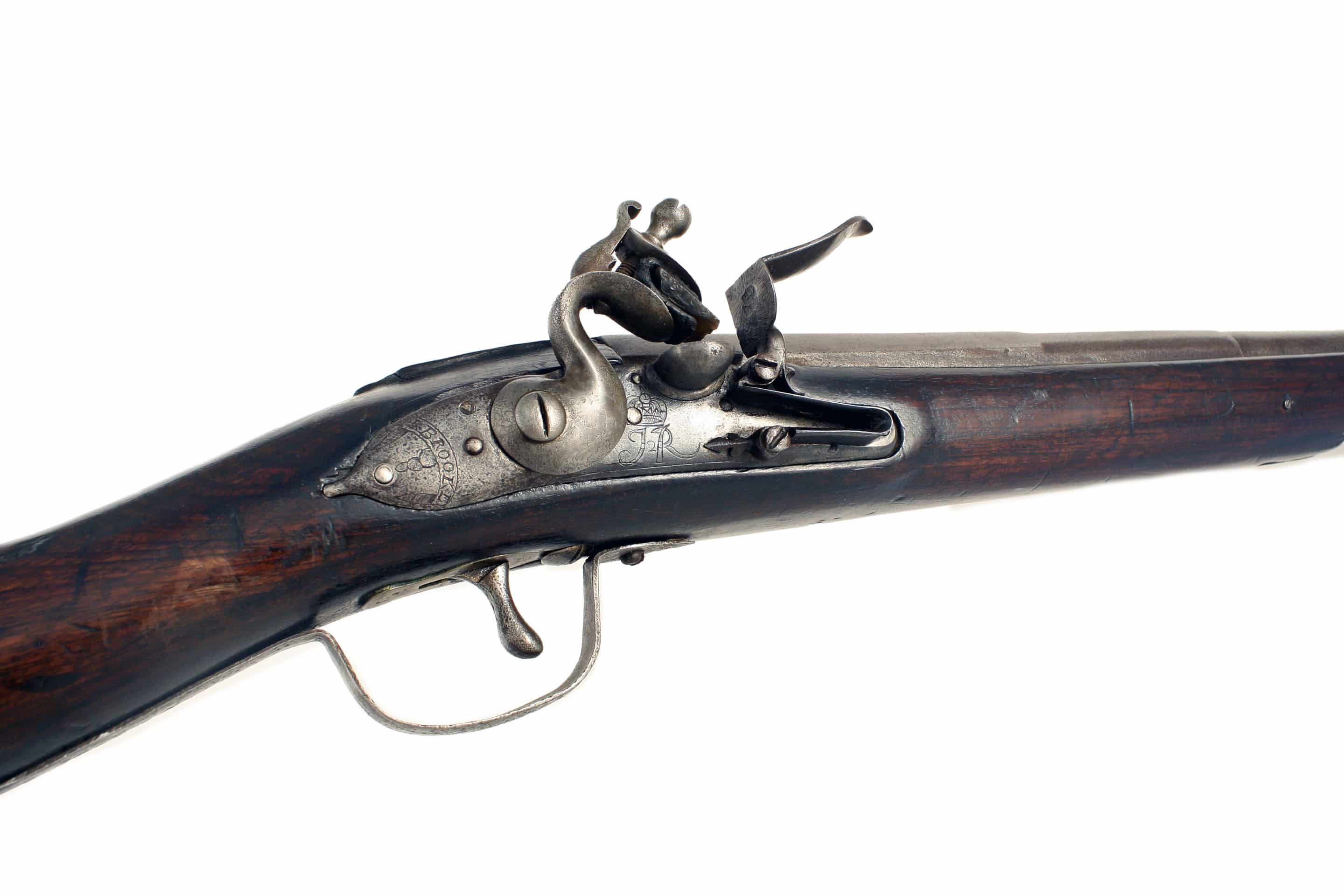 An Incredibly Rare James 2nd Flintlock Carbine by R. Brooke. Circa 1685. With sighted octagonal to round slightly swamped barrel, stamped at the breech with ‘Crowned IR’ mark and various other ordnance marks, a shield and two other marks, plain pang stamped with an Ordnance mark, rounded ‘banana’ lock engraved with a crowned ‘J2R’ cypher beneath the pan and signed on a ribbon across the tail, full-stocked in walnut (with slither repairs to both sides of the stock, see photographs) with brass butt plate nailed into position, steel trigger guard and turned ramrod pipes.