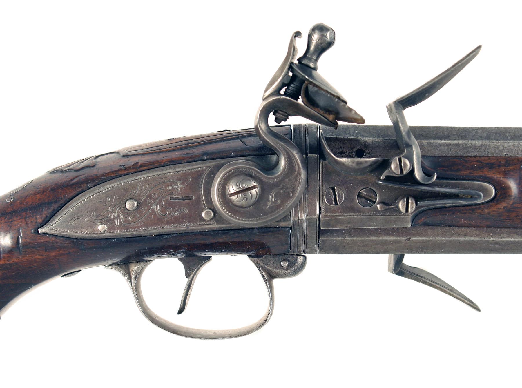 An Incredibly Rare Pair of Flintlock Wender Pistols by Wilson of London. With tapering octagonal to round barrels, signed ‘Minories London’ along the top flat and stamped with London proofs at the breech, released by a baluster catch incorporated in the trigger guards, long slender tangs decorated with foliage, both with two screws, flat bevelled back-action locks, decorated with scrolling foliate and signed ‘WILSON’ on a scroll, the forward sections of the lock each engraved en suite, figured walnut butts inlaid with silver wire, one in the shape of a trophy, the other scrolling foliage, an incredibly rare pair of pistols.
