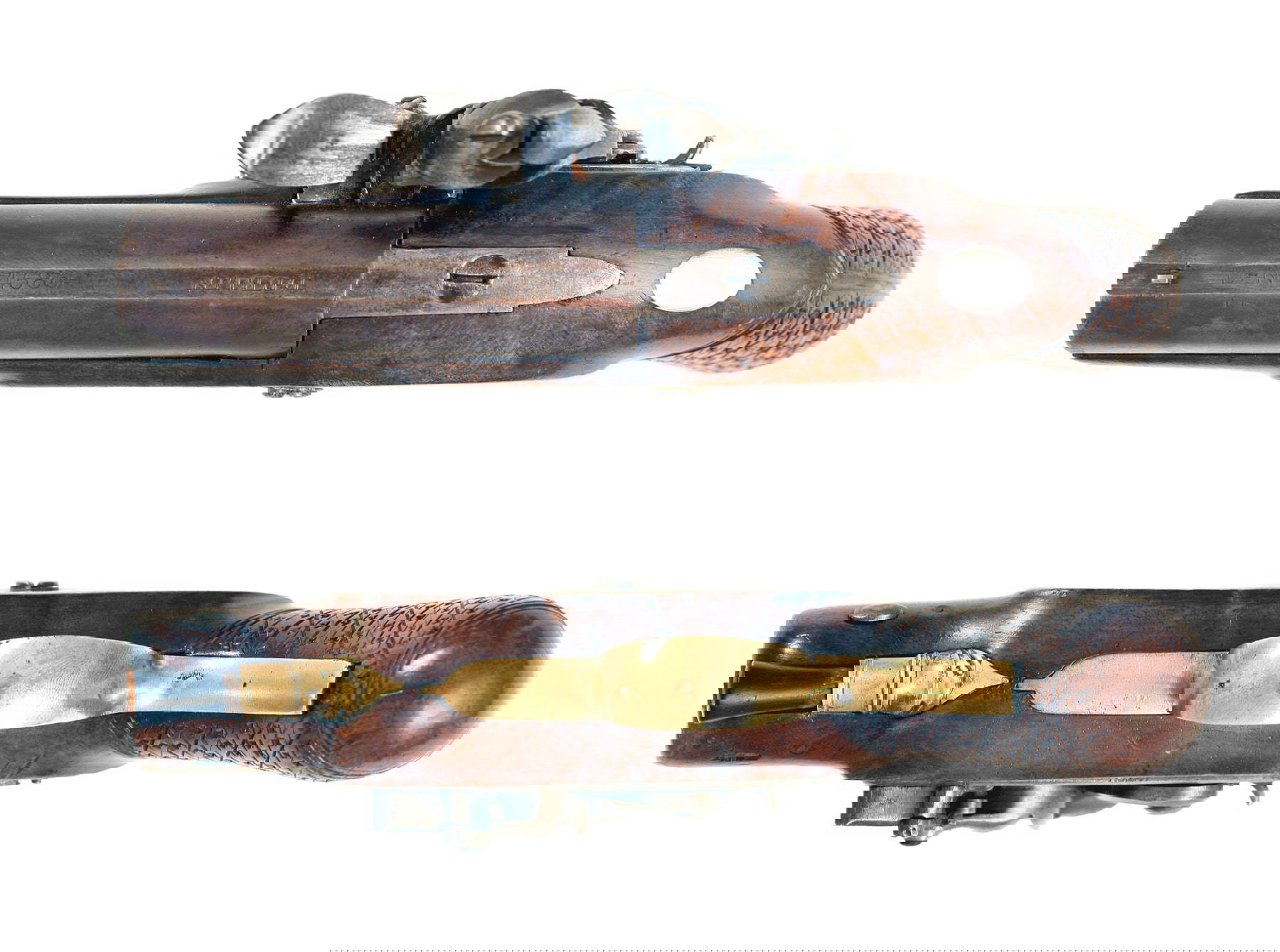 A Good Irish Flintlock Man Stopper by Holland of Dublin. With sighted round barrel, cut with a sighting groove along the top flat, stamped ‘DUBLIN’ and with Irish registration mark, ‘D-N 4586’ plain tang, stepped bevelled lock, signed ‘HOLLAND’ beneath pan and fitted with sliding catch, ‘French’ style cock, full-stocked in walnut and cut with chequering at the grip, plain brass mounts comprising trigger guard and ramrod pipe, horn tipped ramrod.