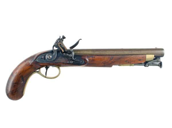 An Irish Flintlock Officers Pistol by Gallagher of Dublin. With round sighted barrel, stamped, ‘DUBLIN’ towards the breech, plain tang, signed lock fitted with sliding safety catch (defective) French style cock, full-stocked in walnut with brass military style mounts, comprising plain trigger guard and ramrod pipes, captive ramrod.