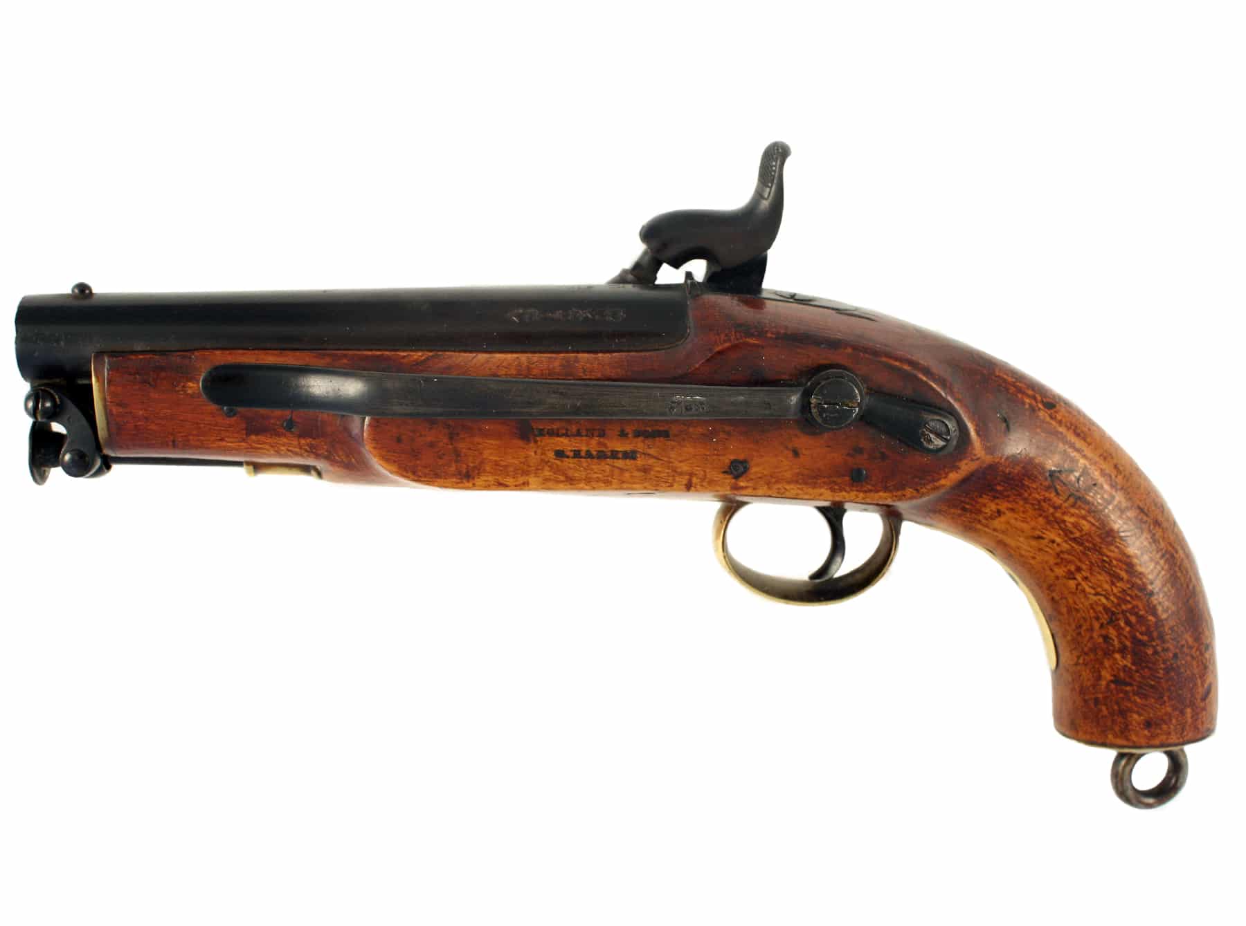 An Untouched 25-Bore Percussion Coastguard Pistol, dated 1849. With round sighted barrel, retaining original blacking and heavily stamped with London proofs and military marks, flat lock with ‘VR’ crowned and ’TOWER 1849’ retaining a large amount of original colour figured full stock stamped with numerous inspection marks and stock makers marks, regulation brass mounts including ovoid butt cap with lanyard ring, heavily stamped belt hook and stirrup ramrod with inspection marks. A lovely military pistol retaining nearly all of its original finish.