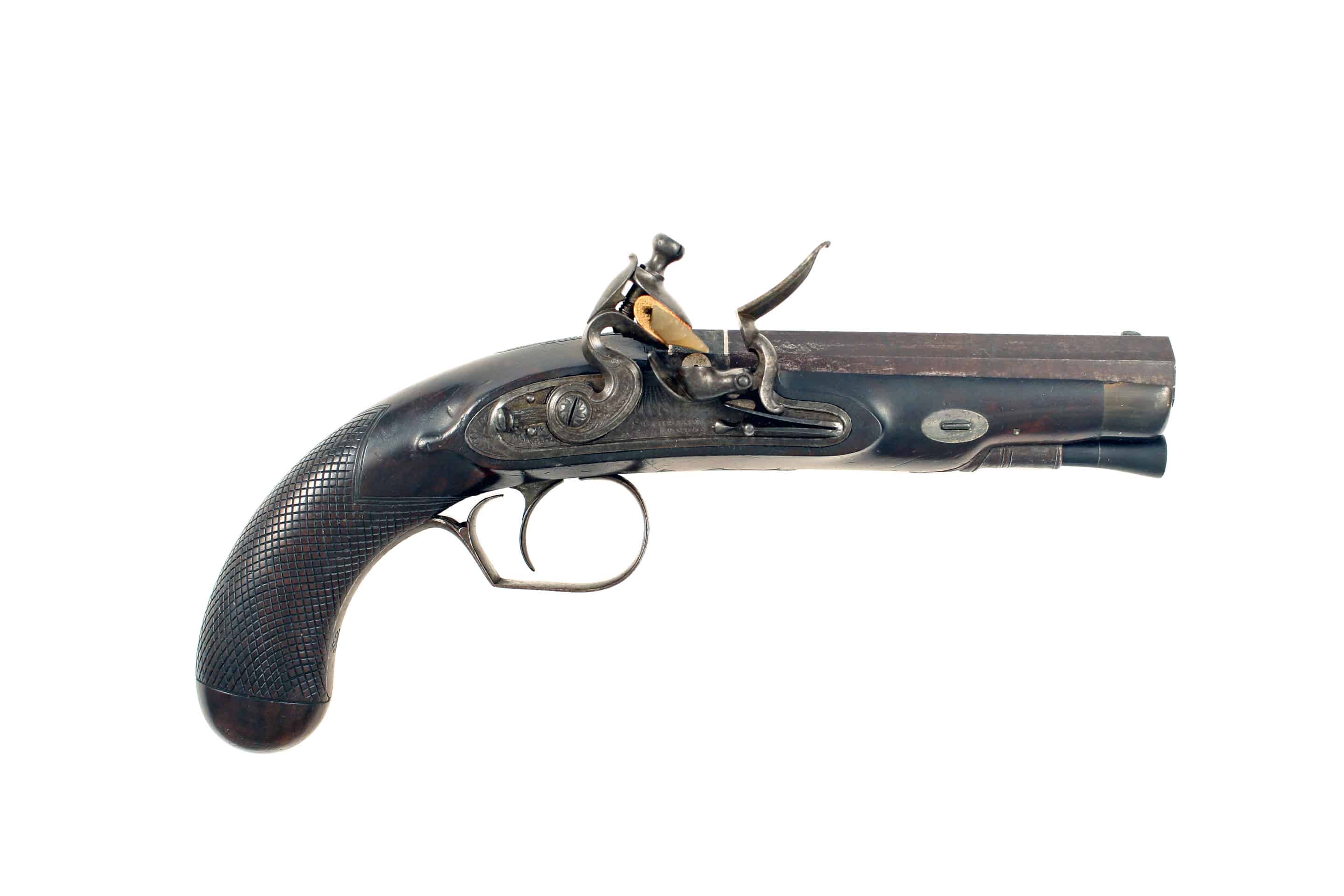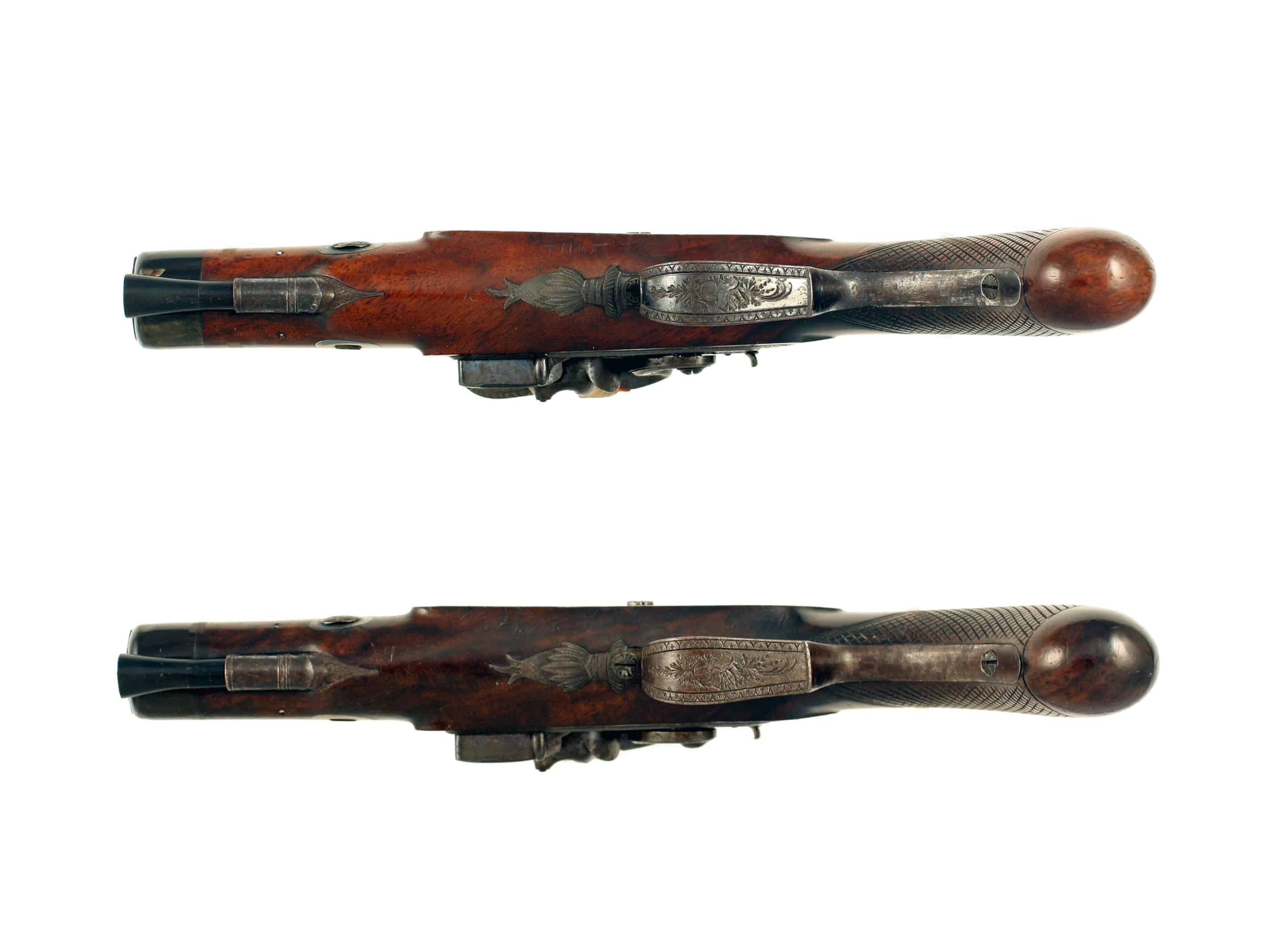An Untouched Pair of Flintlock Overcoat Pistols by Staudenmayer, No. 1289 for 1811. With octagonal sighted barrels, case-hardened breeches inlaid with two platinum lines, platinum lined touch-holes and oval platinum poincons stamped ’STAUDENMAYER LONDON’ profusely engraved tangs fitted with standing rear-sights, stepped bevelled locks, fitted with sliding safety catches, signed beneath the pans and decorated with scrolling foliage at the tails, cocks decorated en suite, full-stocked in walnut and cut with chequering at the grips, horn fore-end caps, steel border engraved trigger guards, decorated with stands of arms on the bows and detailed pineapple finials (retaining traces of blues) turned ramrod pipes and horn-tipped ramrods, one with concealed worm: in there original lined and fitted case with some accessories including, powder flask, bullet mould, loading rod and key to the case.