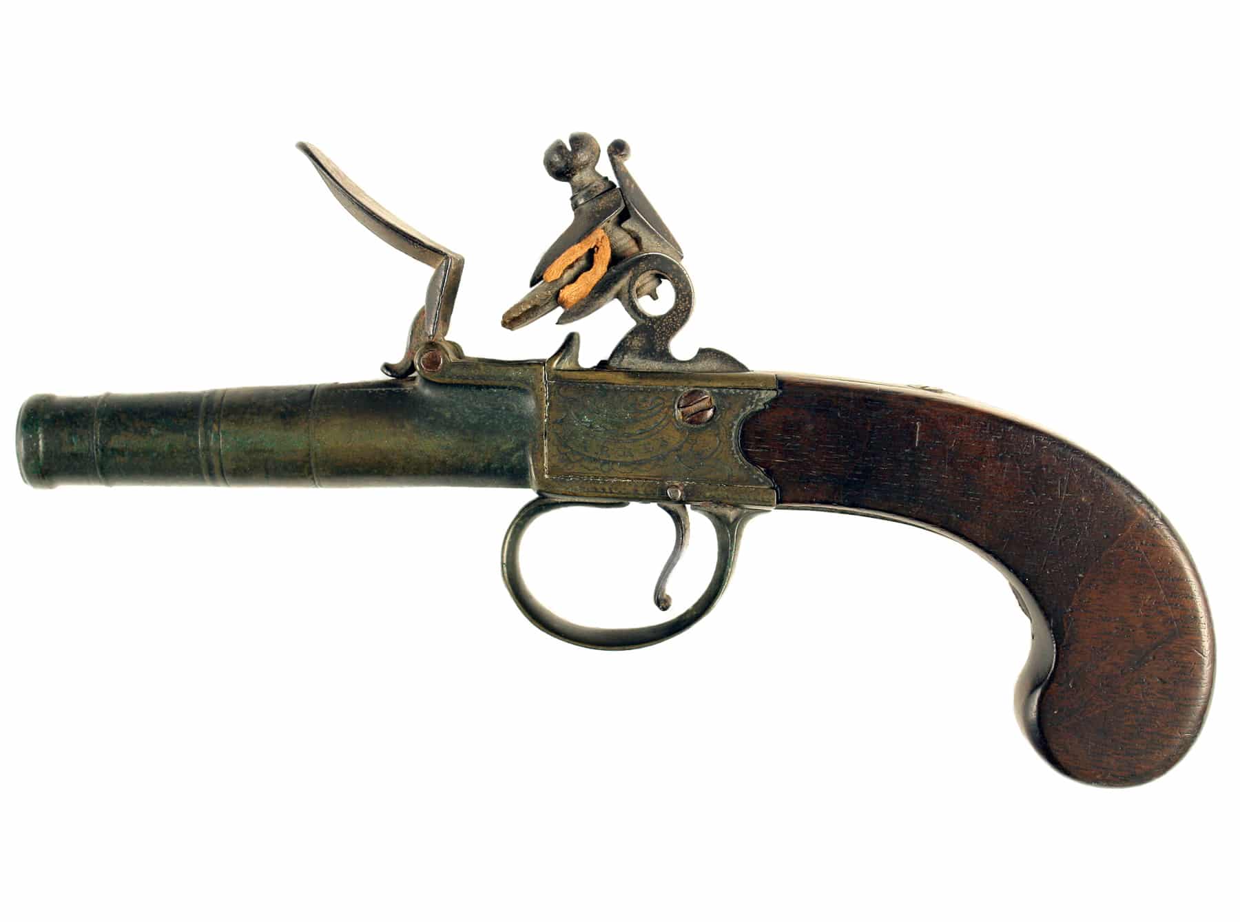An Untouched Flintlock Cannon-Barrelled Pistol by Parkes of London. With brass three-stage turn-off cannon barrel, stamped below with Birmingham proofs, foliate engraved brass frame signed London on a foliate scroll to the right and Parkes on a foliate scroll to the left, sliding trigger safety catch, slab-sided walnut butt, in completely untouched condition, the brass is almost black, finding guns in this condition these days is incredibly difficult.