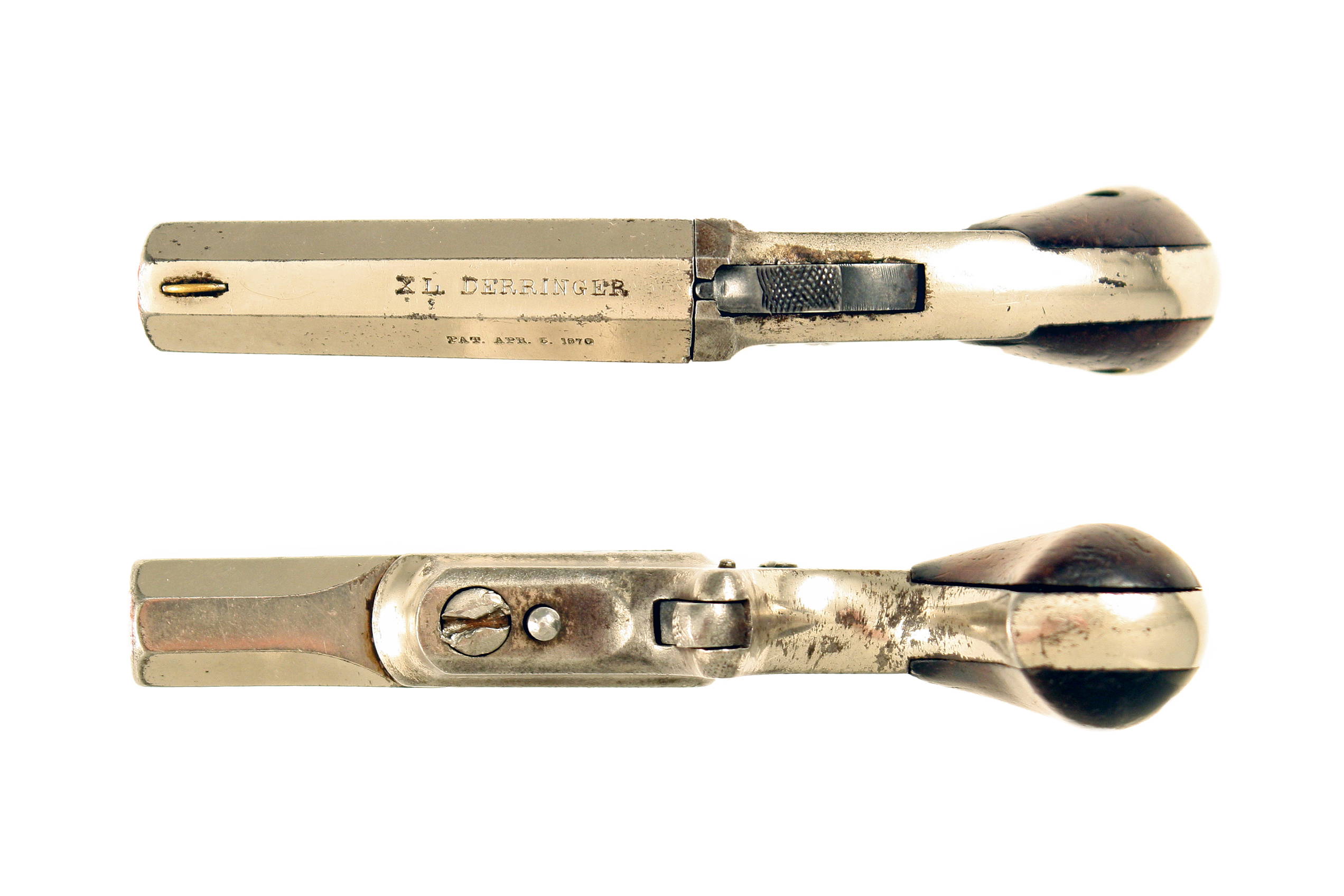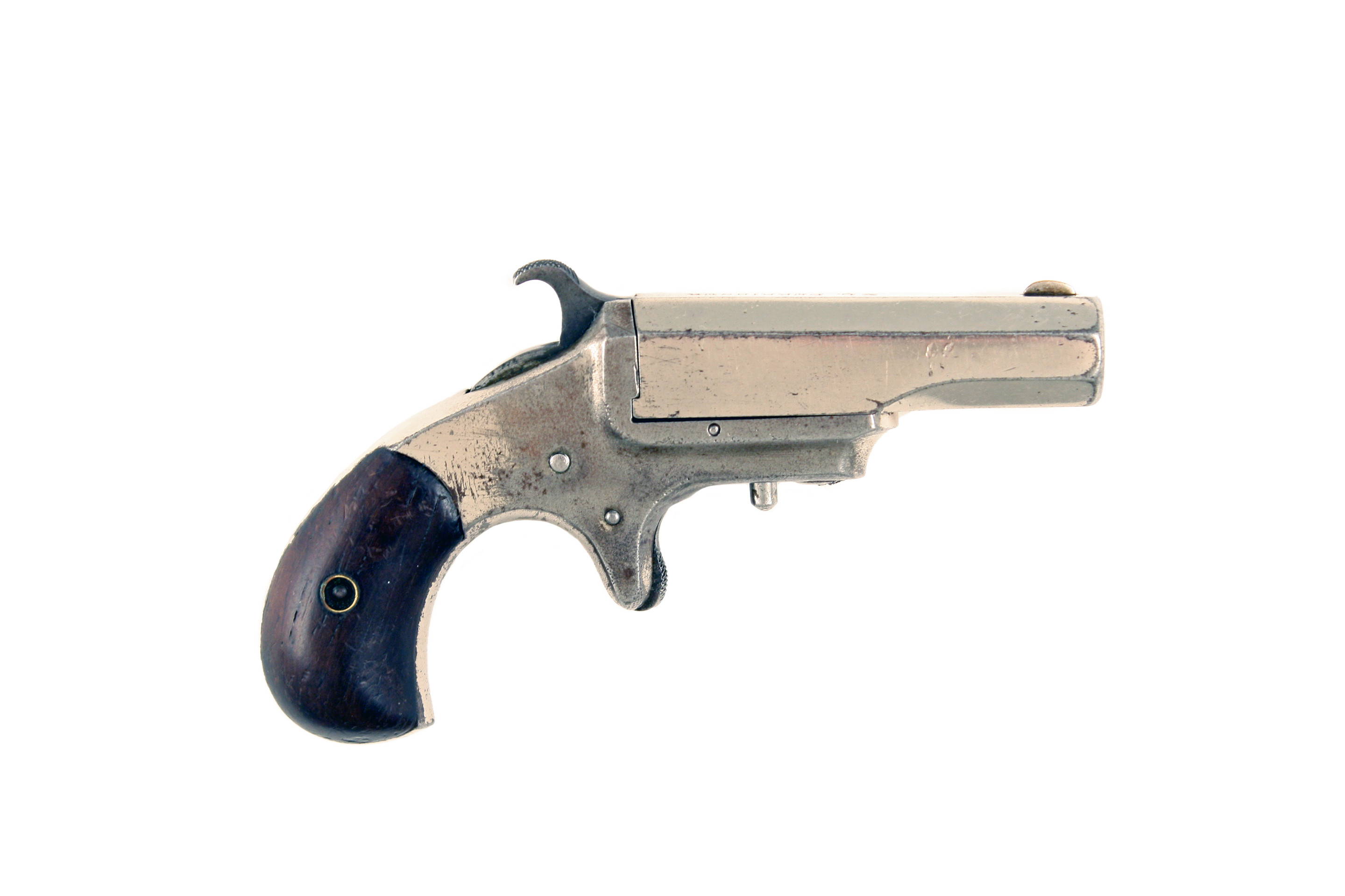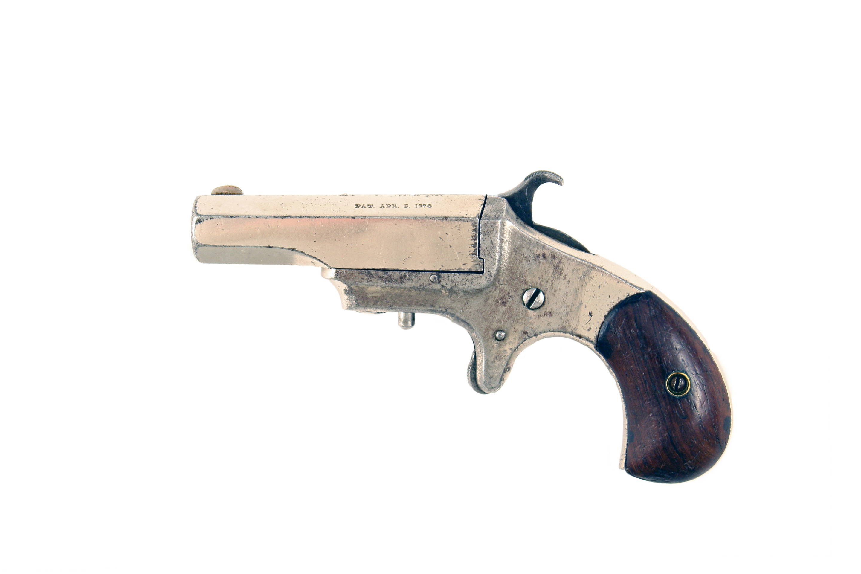 An XL Derringer Pistol. Octagonal sighted barrel, stamped, ‘XL DERRINGER’ along the top flat and the left hand side stamped, ‘PAT. APR. 5. 1870.’ Retaining all original nickel plating, steel frame, with slab rosewood grips.