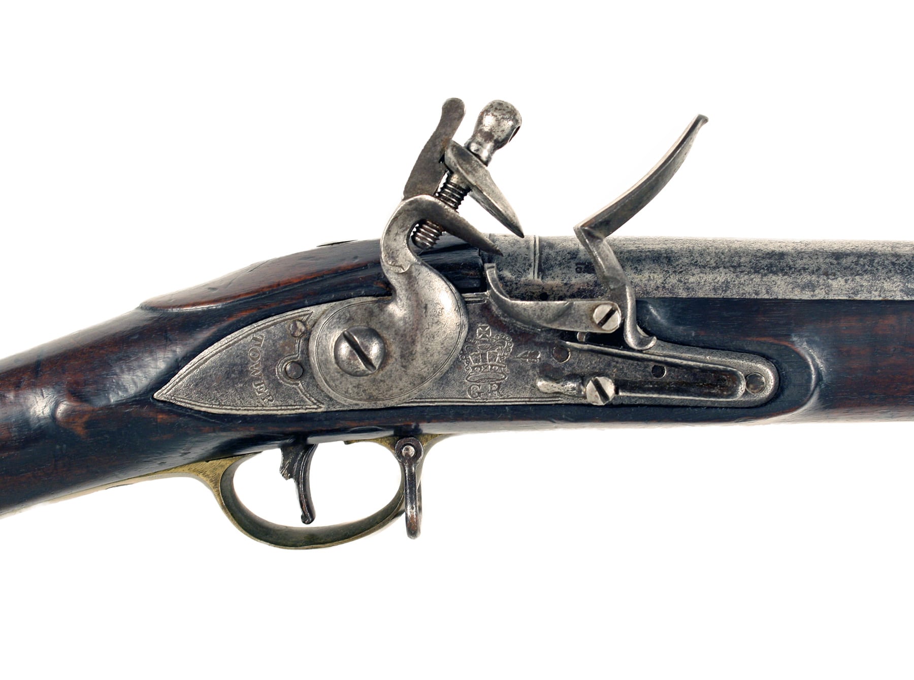 An India Pattern Brownbess. With round barrel struck with large King’s proof marks, rounded lock incised with double border lines and marked ‘TOWER’ on the tail and with ‘GR’ cypher beneath the pan, walnut three-quarter stock with stamps including a shield-shaped crowned mark above the number ‘150’ on the right side of the butt, brass mounts, iron sling mounts, and iron ramrod (old repair to base of stock).