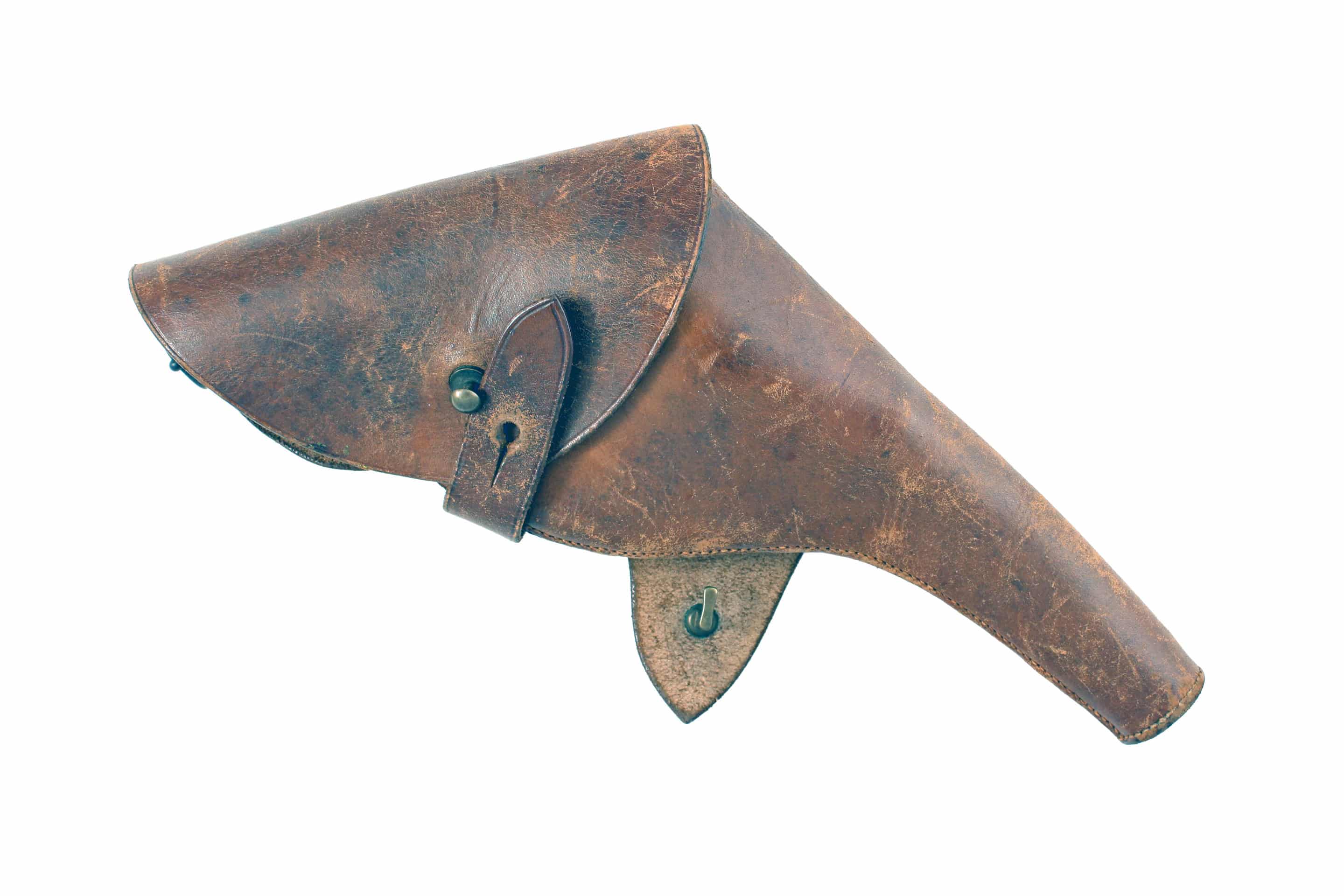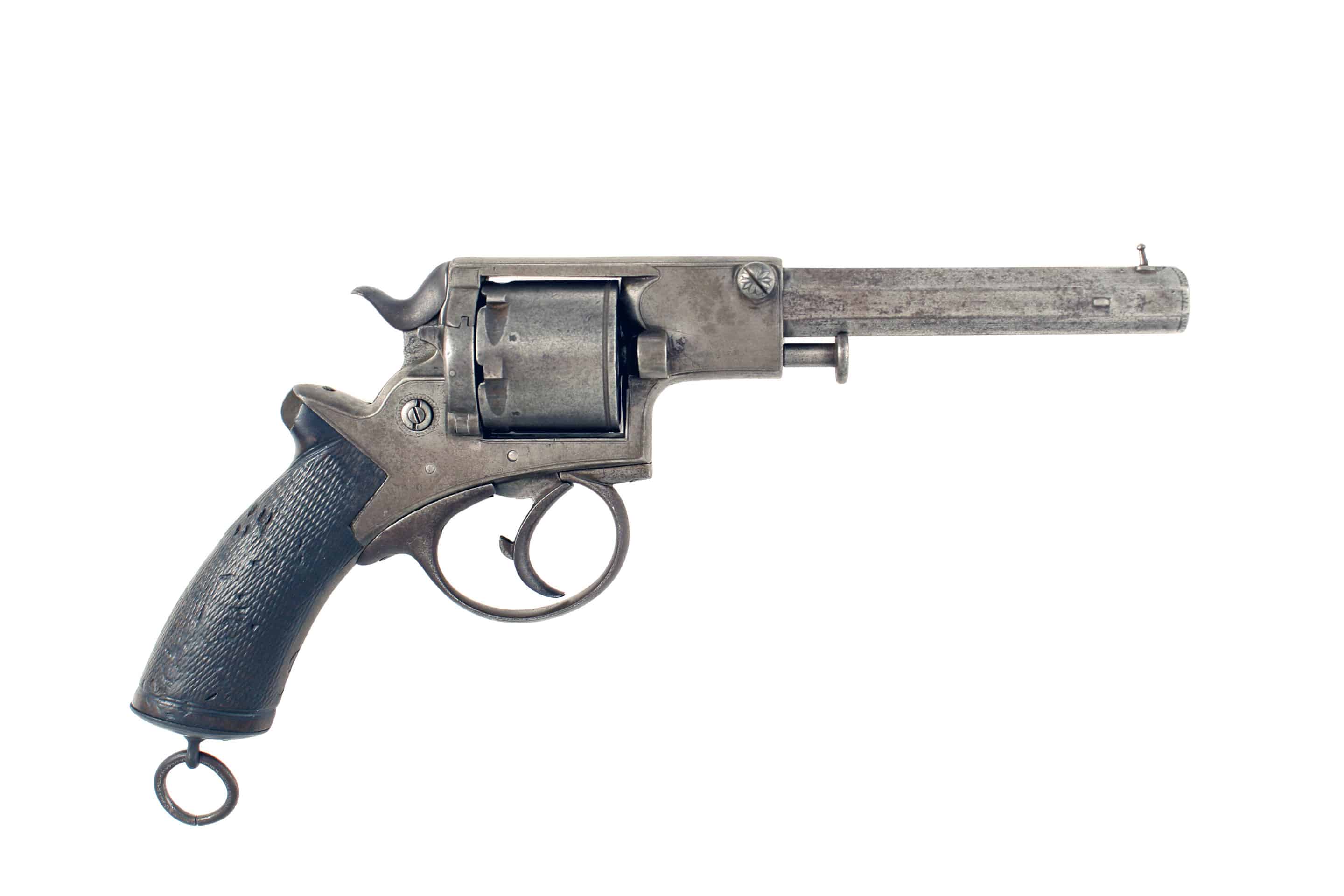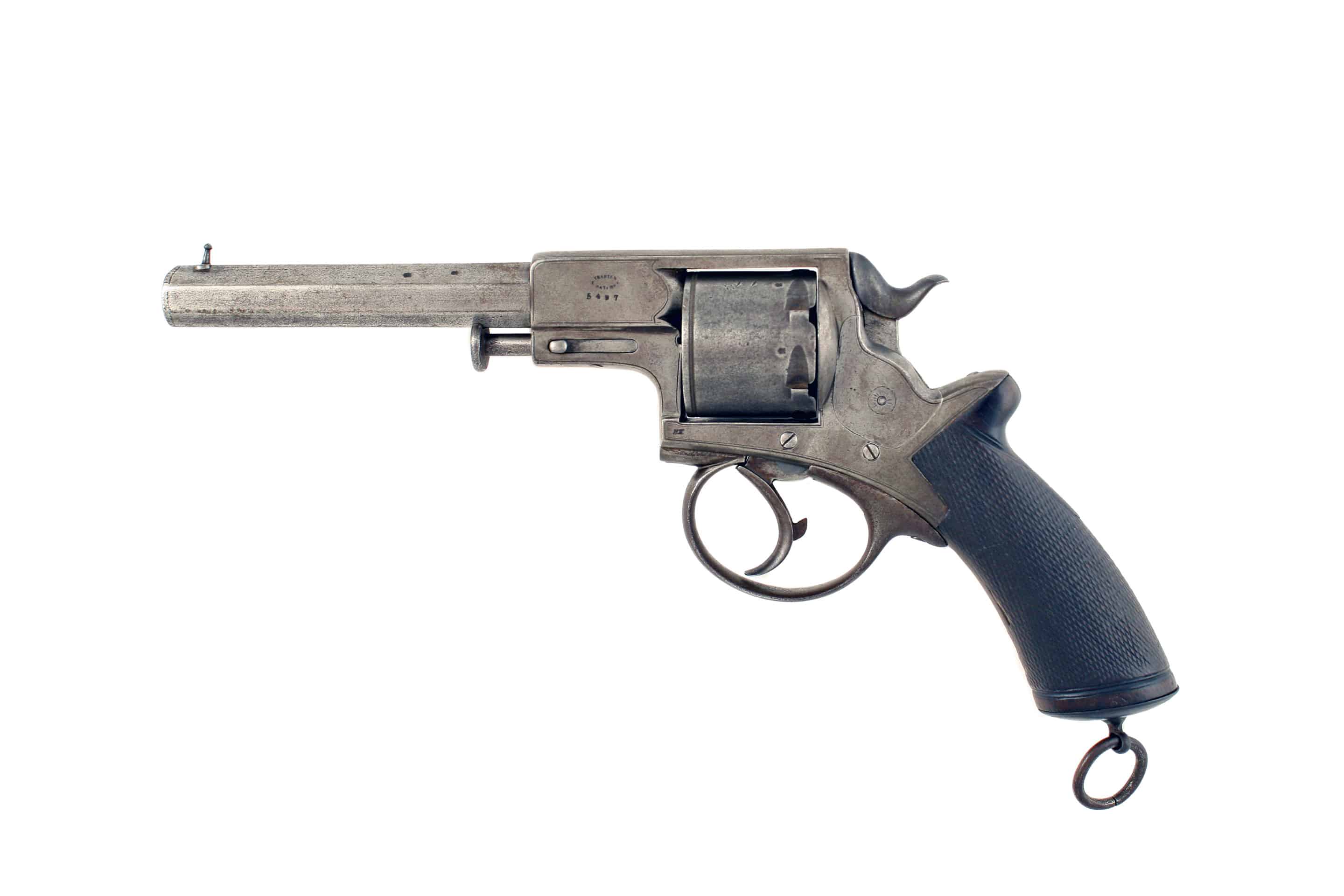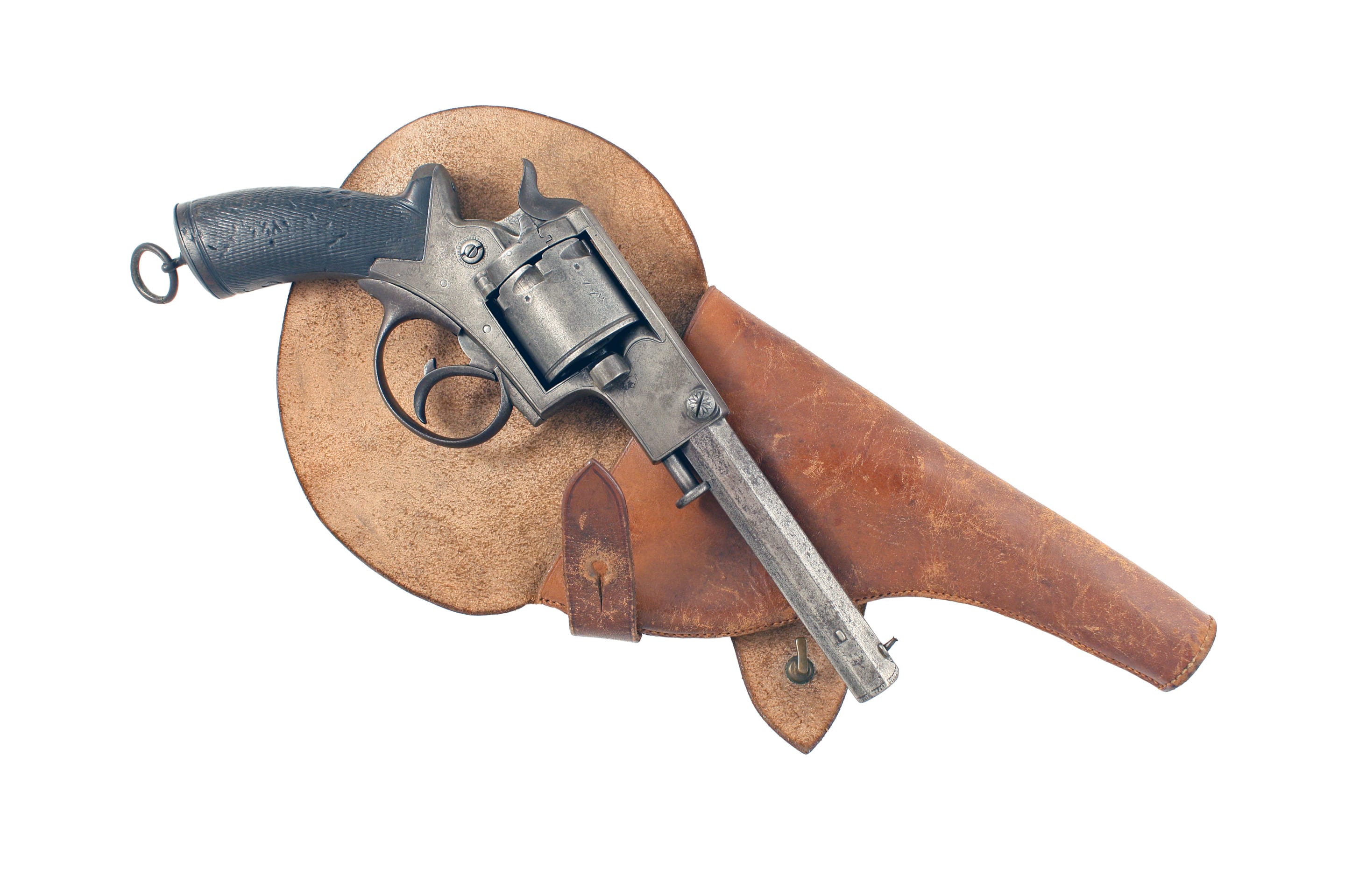 A Six-Shot .45 Rimfire Tranter Revolver for Restoration. Trigger rotates cylinder but does not engage hammer. Missing loading rod. In original leather holster.